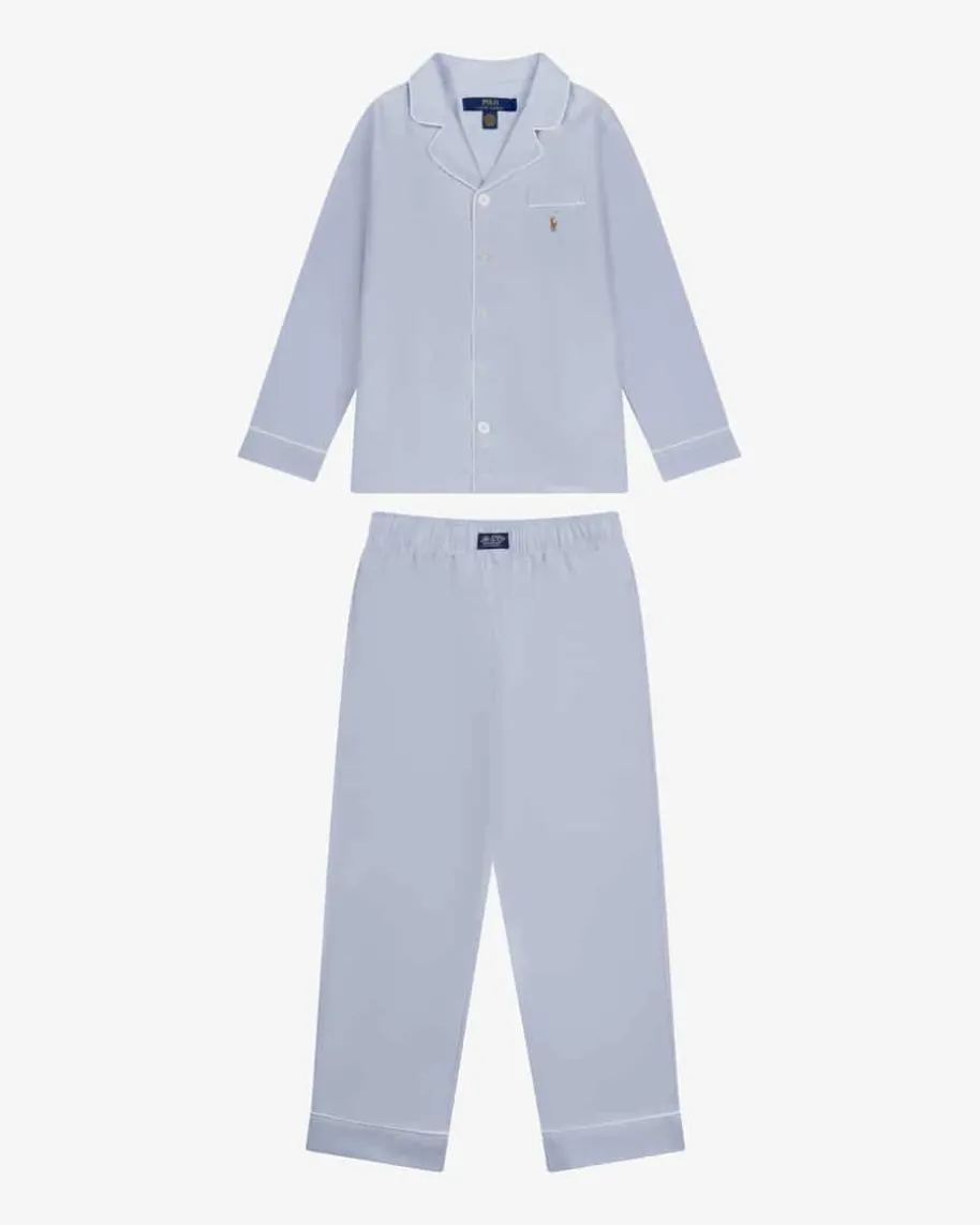 Schlafanzug für Jungen von Polo Ralph Lauren in Hellblau. Das Modell bestichtdank der melierten Baumwoll-Qualität mit angenehmen Tragemomenten, während dielabeltypische Logo-Stickerei und farblich abgesetzt Paspelierungen ein modischesGesamtbild kreieren.