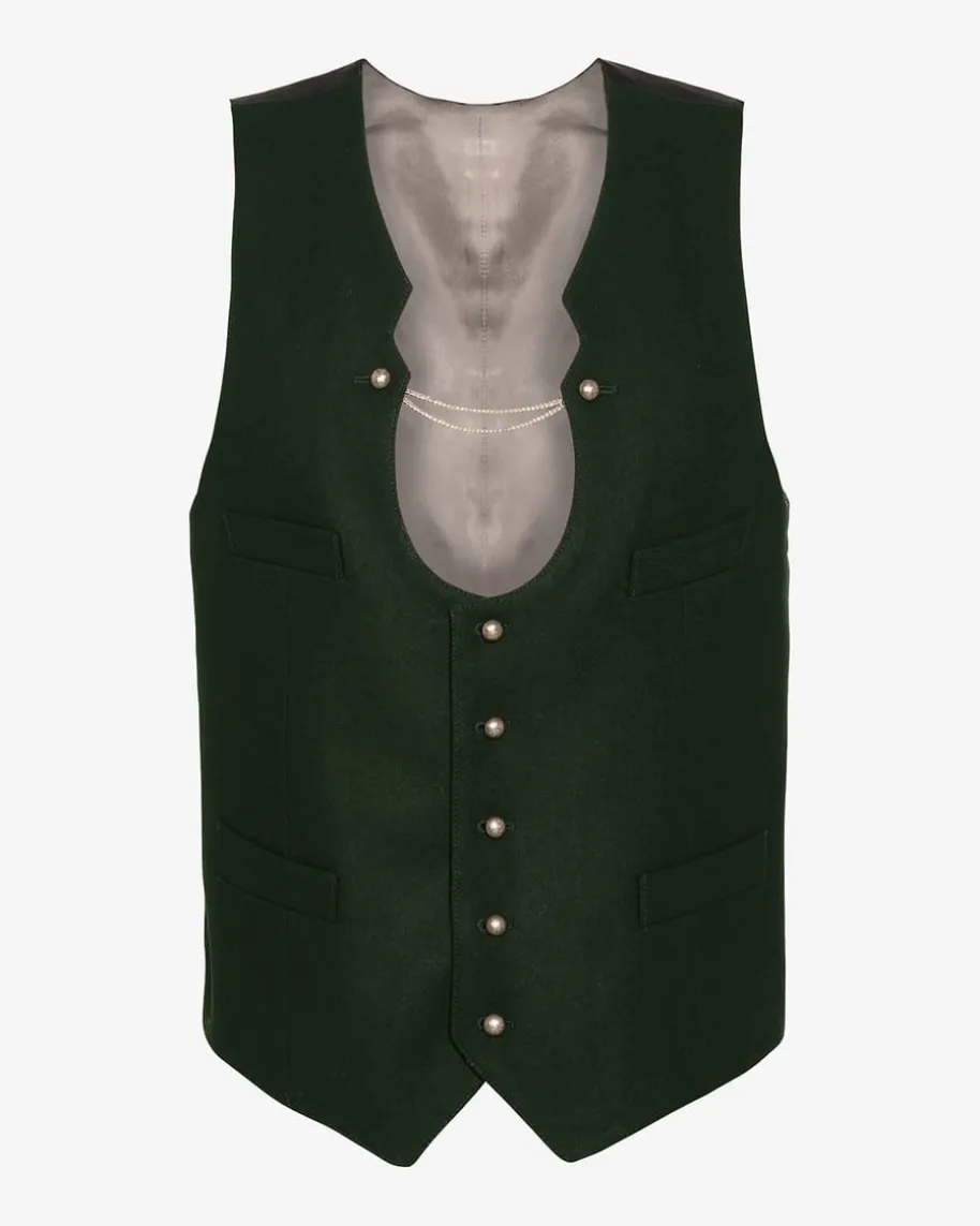 Schlattan Trachtenweste für Herren von Grasegger Manufaktur in Dunkelgrün. Die Weste erweist sich durch die Kombination aus dunkler Schurwolle auf der Vorderseite und changierendem Stoff auf der Rückseite als edler Akzent für die Tracht. Dekorative Knöpfe, ein Ausschnitt im Stil der Miesbacher Tracht und vier Taschen ergänzen das Modell stilvoll.