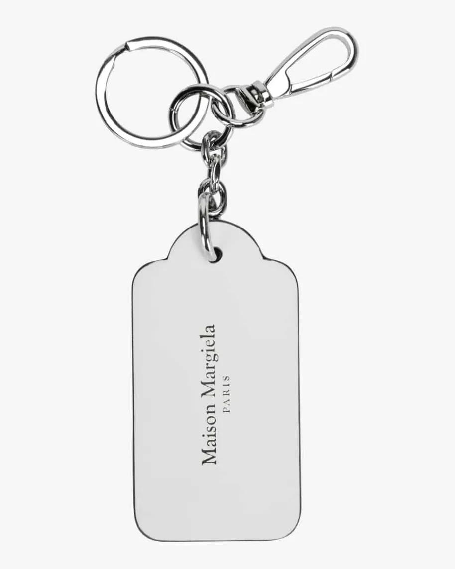 Schlüsselanhänger von Maison Margiela in Weiß und Schwarz. Dieses Modell punktetdank des cleanen Designs aus hochwertigem Kalbsleder, während der Karabiner-Verschluss das Accessoire praktisch komplettiert.
