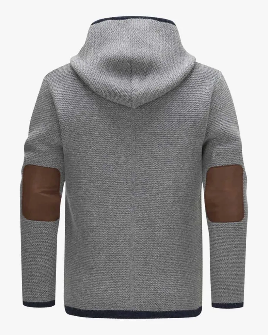 Schönbrunn Trachten-Strickjacke für Herren von Schorsch Hackl in Grau und Navy.Klassisch gestrickt und aus hochwertiger Lammwolle gefertigt, überzeugtdas Modell als warmer Begleiter für komfortable Trachten-Looks, der durch dieLeder-Patches am Ellenbogen sowie die rustikalen Hornknöpfe einen traditionellenCharakter erhält.