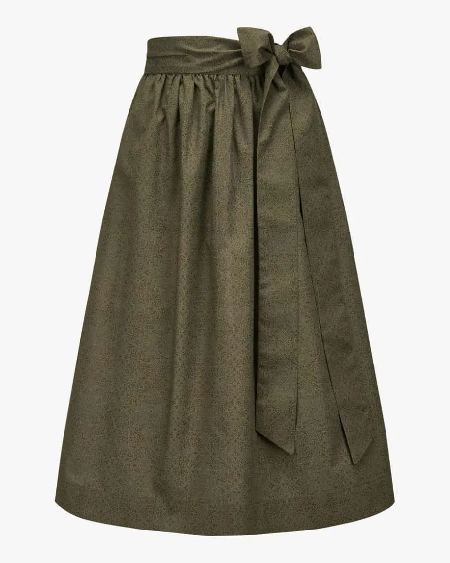Schürze für Damen von LODENFREY in Oliv. Das Modell präsentiert sich mitleichter Baumwoll-Qualität und feinem Ornament-Muster – Ein femininer Begleiterfür vielseitige Trachten-Looks.