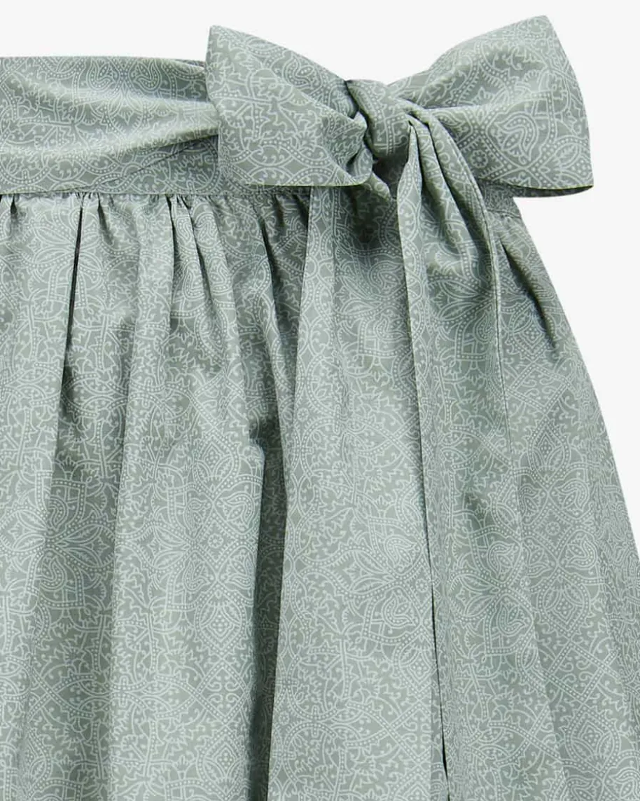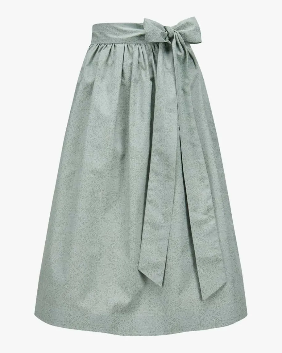 Schürze für Damen von LODENFREY in Salbei. Das Modell präsentiert sich mitleichter Baumwoll-Qualität und feinem Ornament-Muster – Ein femininer Begleiterfür vielseitige Trachten-Looks.
