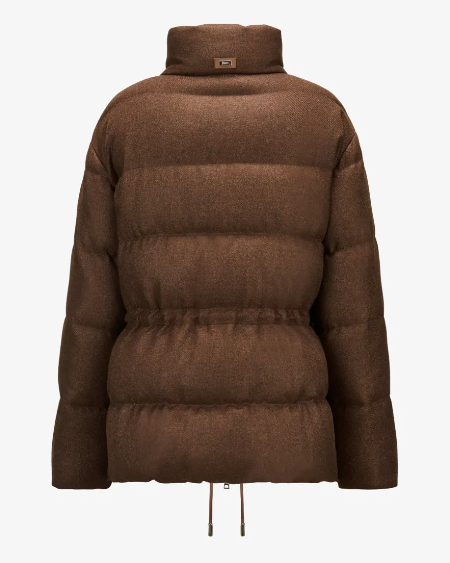 Schurwoll-Seiden-Daunenjacke für Damen von Herno in Kastanie. Die italienischeMarke kombiniert Funktionalität mit Luxus – insbesondere im Bereich hochwertigerJacken und Mäntel. Auch dieses Modell punktet als Favorit an kühlen Tagen dankder hochwertigen Daunen-Feder-Füllung, während die stilvoll melierte Optik unddie Kalbsleder-Details das Gesamtbild mit dezenten Country-Vibes abrunden.
