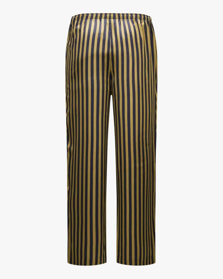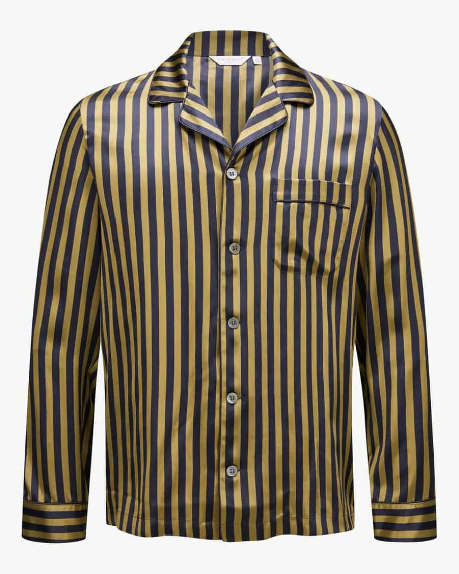 Seiden-Pyjama für Herren von Derek Rose in Navy und Gold. DasFamilienunternehmen steht für hochwertige Nachtwäsche und überzeugt mitexklusivem Komfort sowie perfekter Verarbeitung. Das Loungewear-Set versprichtdank der hochwertigen Seiden-Qualität sowie der legeren Passform erstklassigeWohlfühlmomente, während die modische Hemd-Optik mit stilvollem Streifen-Dessinden letzten Schliff verleiht.
