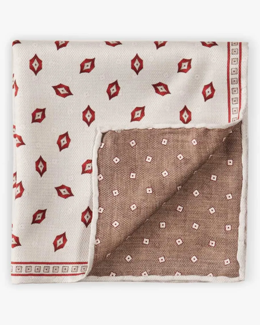 Seiden-Wende-Einstecktuch für Herren von Brunello Cucinelli in Stein, Taupe undRot. Made in Italy – Das Modell begeistert dank beidseitigem Muster ingeometrischem Design als stilvolles Accessoire mit praktischer Wende-Möglichkeit. Zugleich verleiht die fein strukturierte Seiden-Verarbeitung eineedle Haptik wie auch Optik.