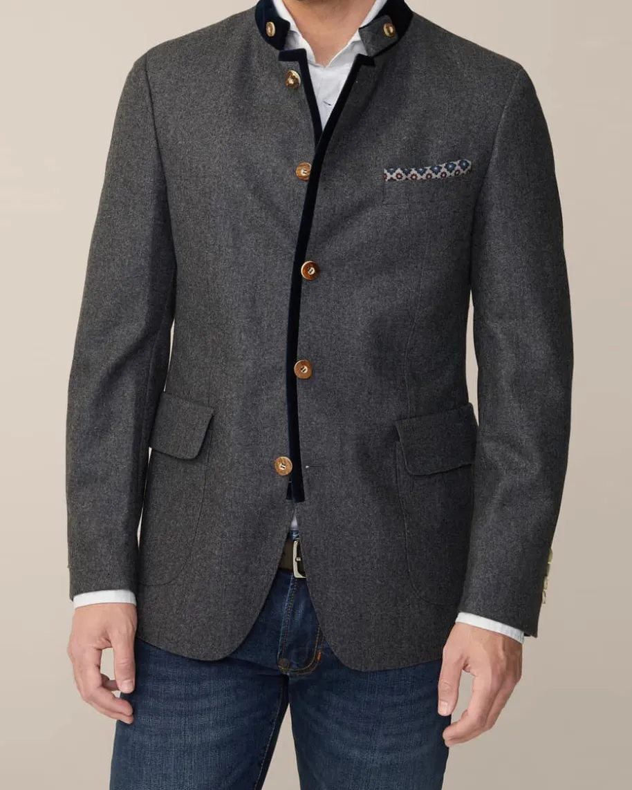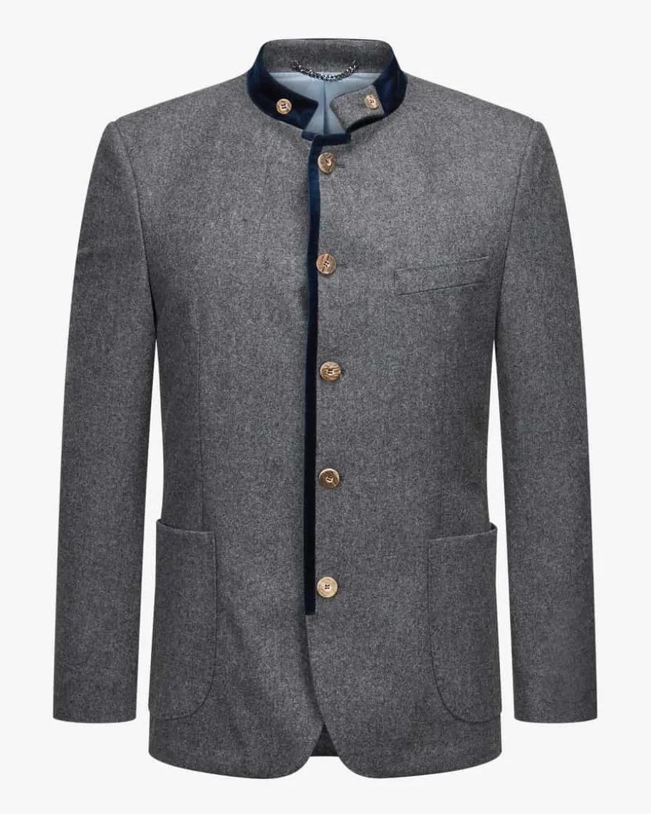 Sendling Trachten-Janker für Herren von Windsor in Hellgrau und Dunkelblau. Dastraditionell inspirierte Modell aus italienischem Wolltuch überzeugt durchraffinierte Details wie edle Samt-Elemente oder echte Hirschhorn-Knöpfe. Dieideale Ergänzung zum Trachtenlook!