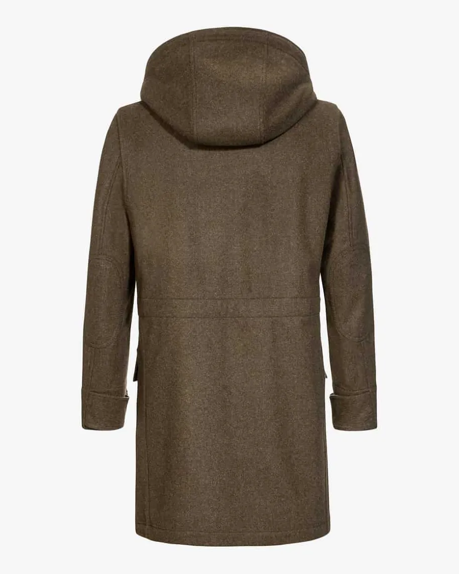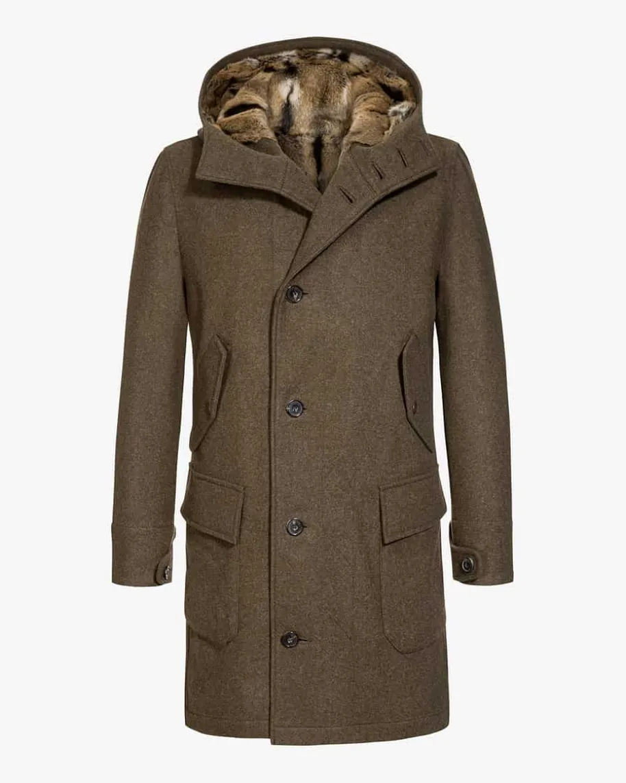 Sigismund Mantel für Herren von Habsburg in Braun. Der gerade geschnitteneMantel präsentiert sich mit Ellbogen-Patches und melierter Optik, währendklassische Details einen modischen Begleiter für Büro und Freizeit schaffen.Highlight ist der edle Pelzbesatz im Innenfutter.