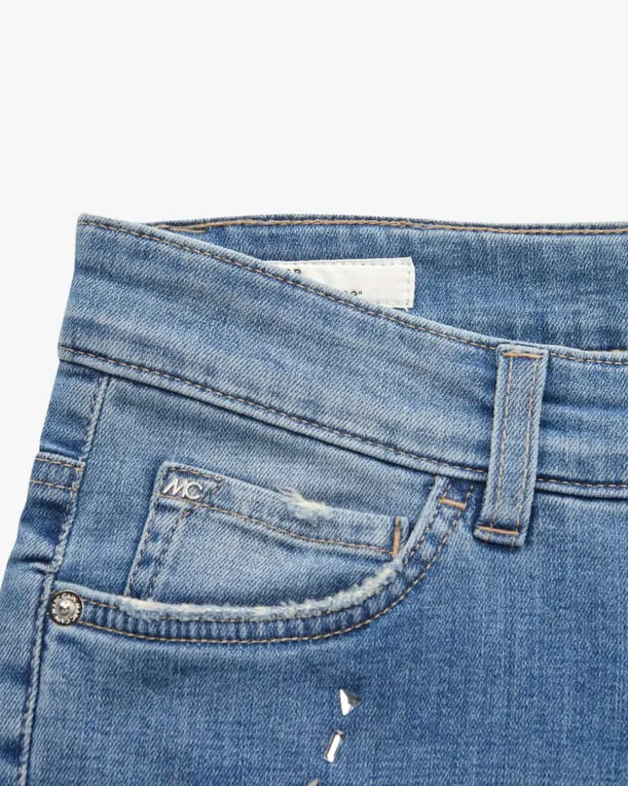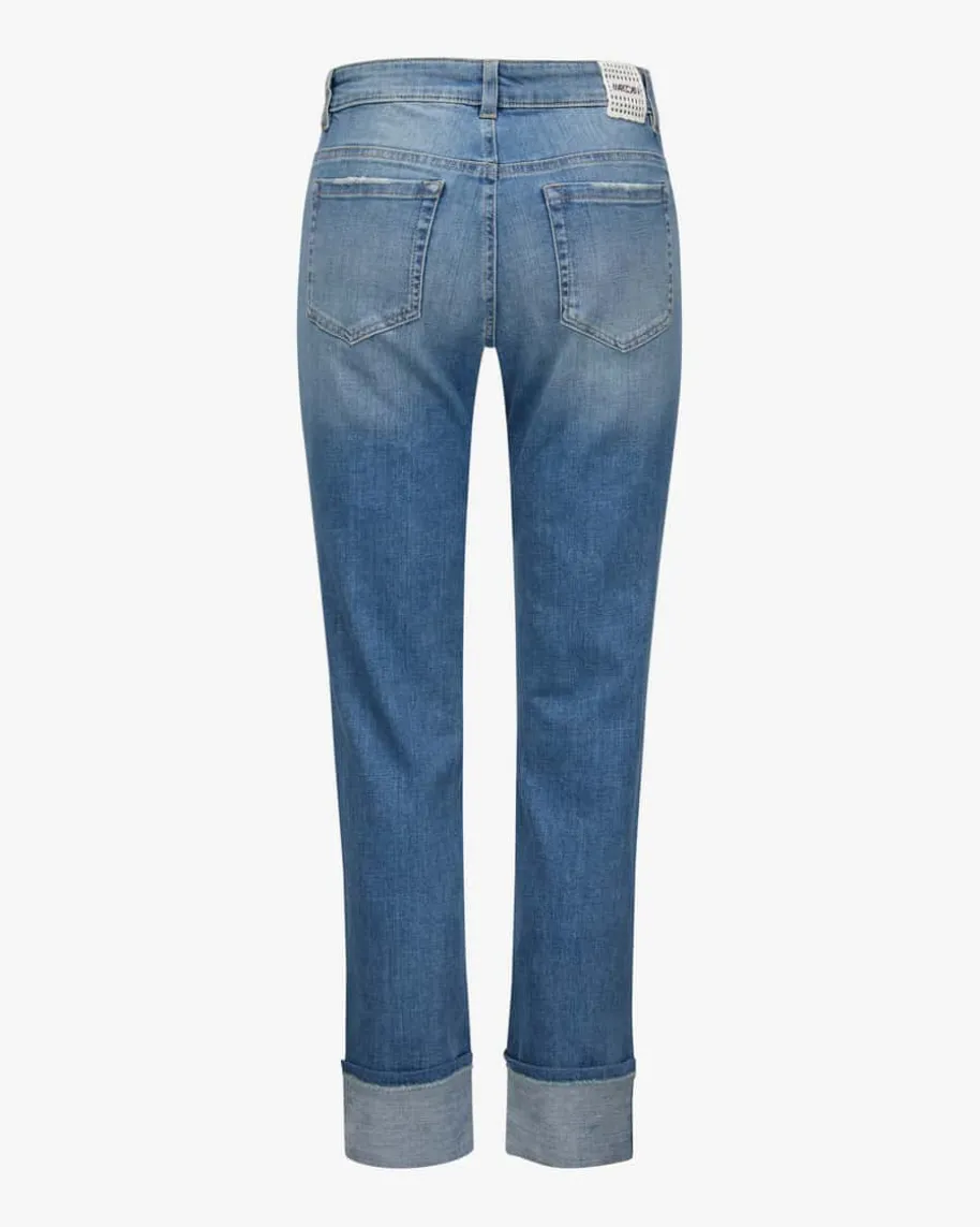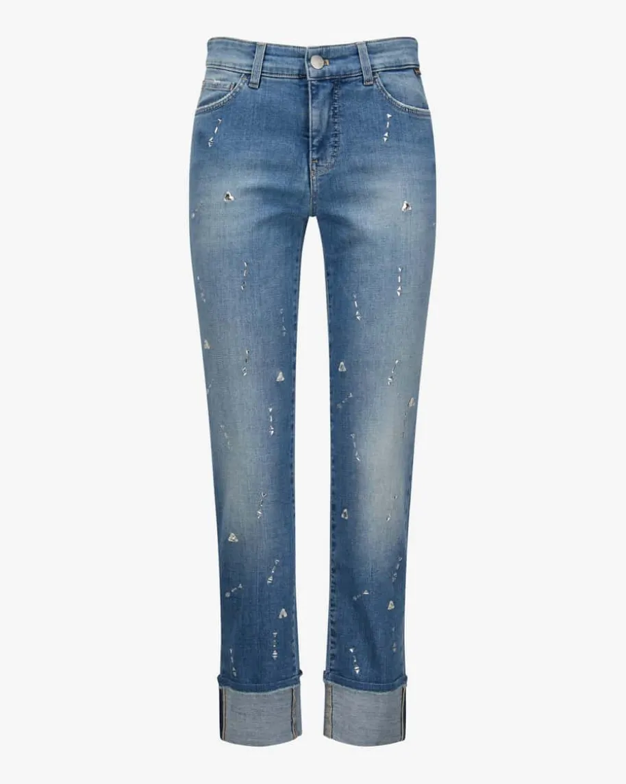 Sikar 7/8-Jeans Slim Fit Low Waist für Damen von Marc Cain in Blau. Das Modellpräsentiert sich mit schmaler Passform und umgeschlagenen Beinenden, während diedezenten Destroyed-Details sowie changierenden Schmuckstein-Applikationenbesondere Akzente setzen.