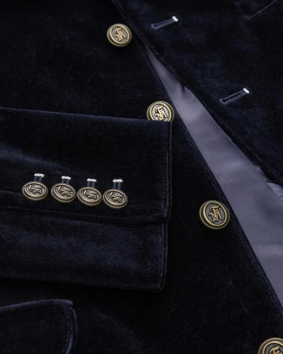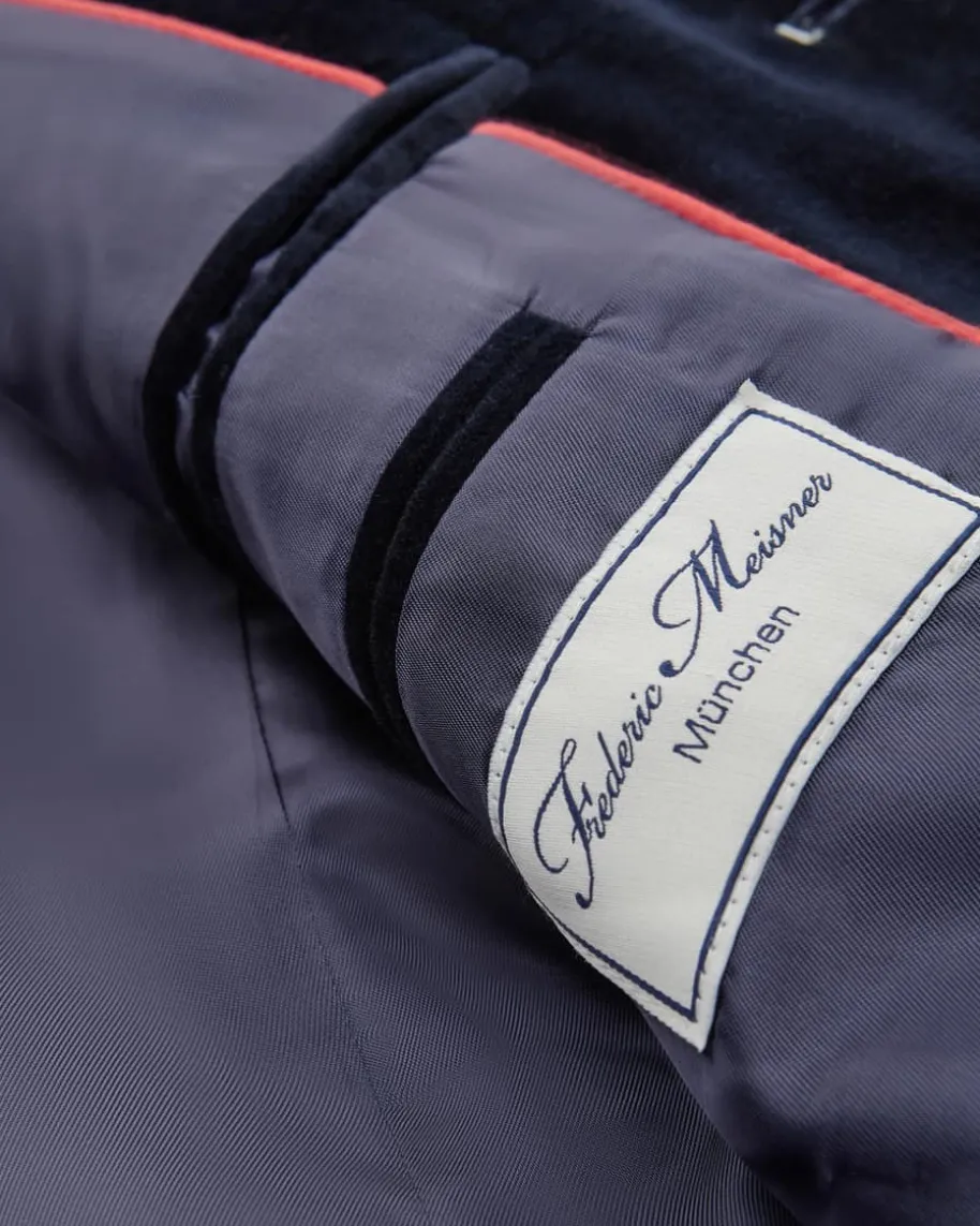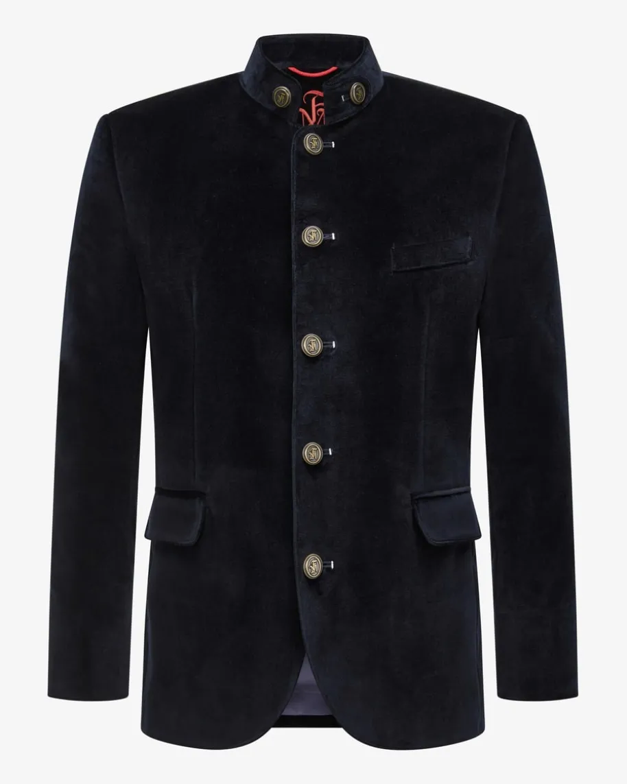 Silas Trachten-Samtjanker für Herren von Frederic Meisner in Nachtblau. DasModell besticht dank der weichen Baumwollsamt-Qualität in stilvoller Aufmachung,während edle Metallknöpfe mit Initialen des Labels das maskuline Trachten-Outfitperfekt abrunden.