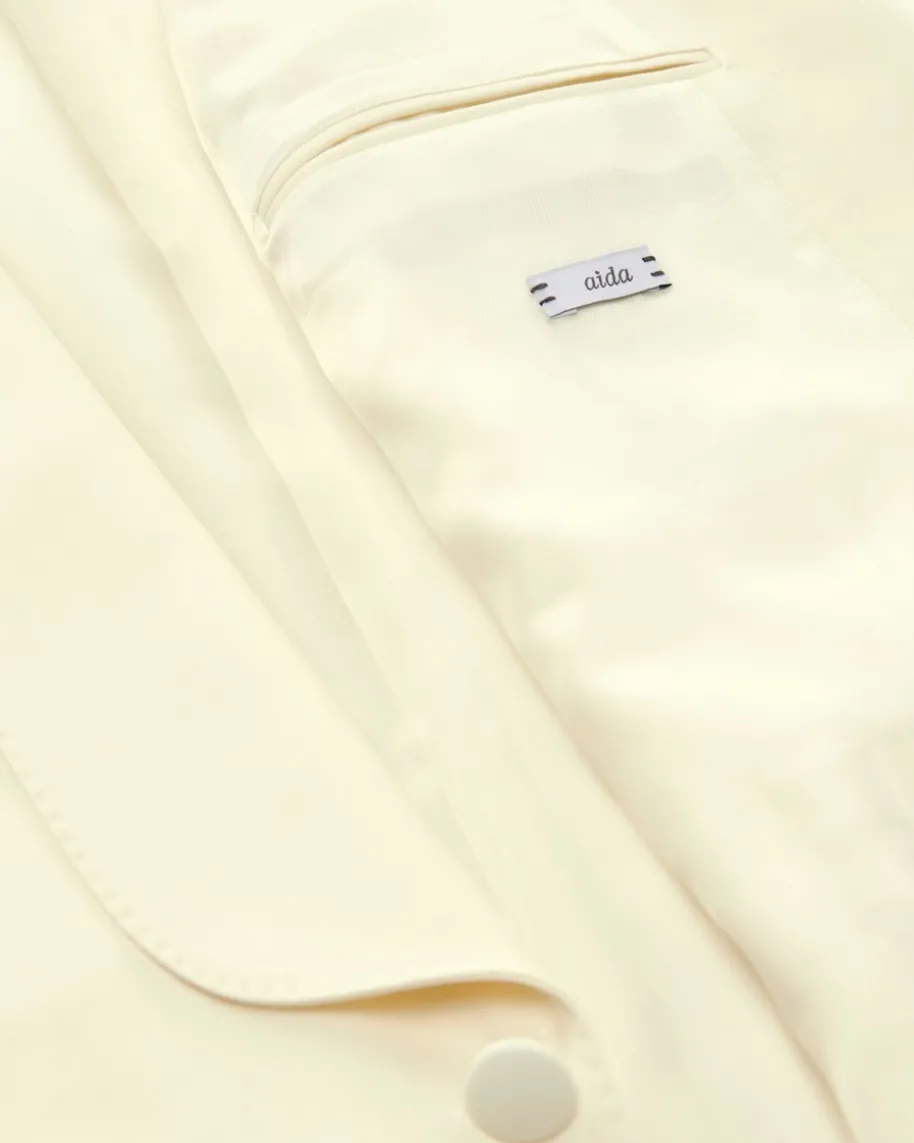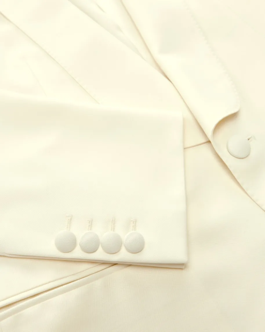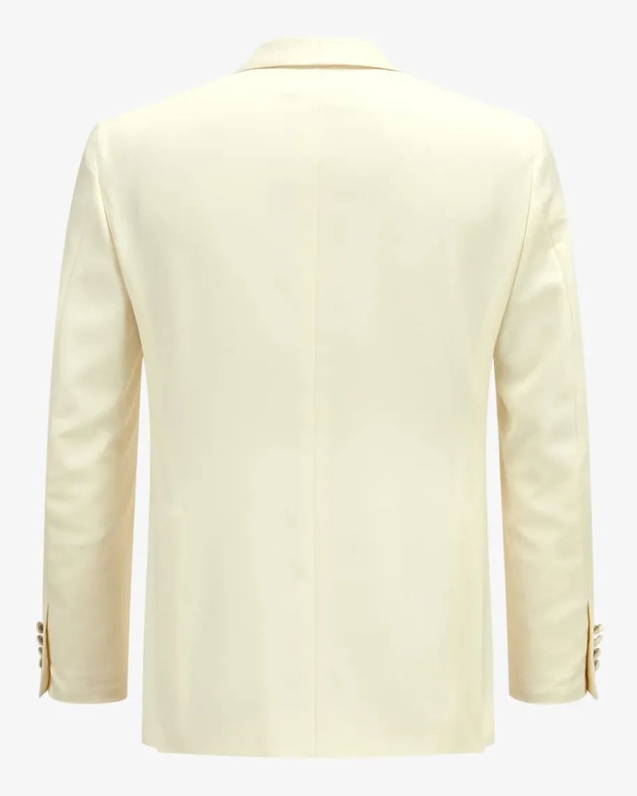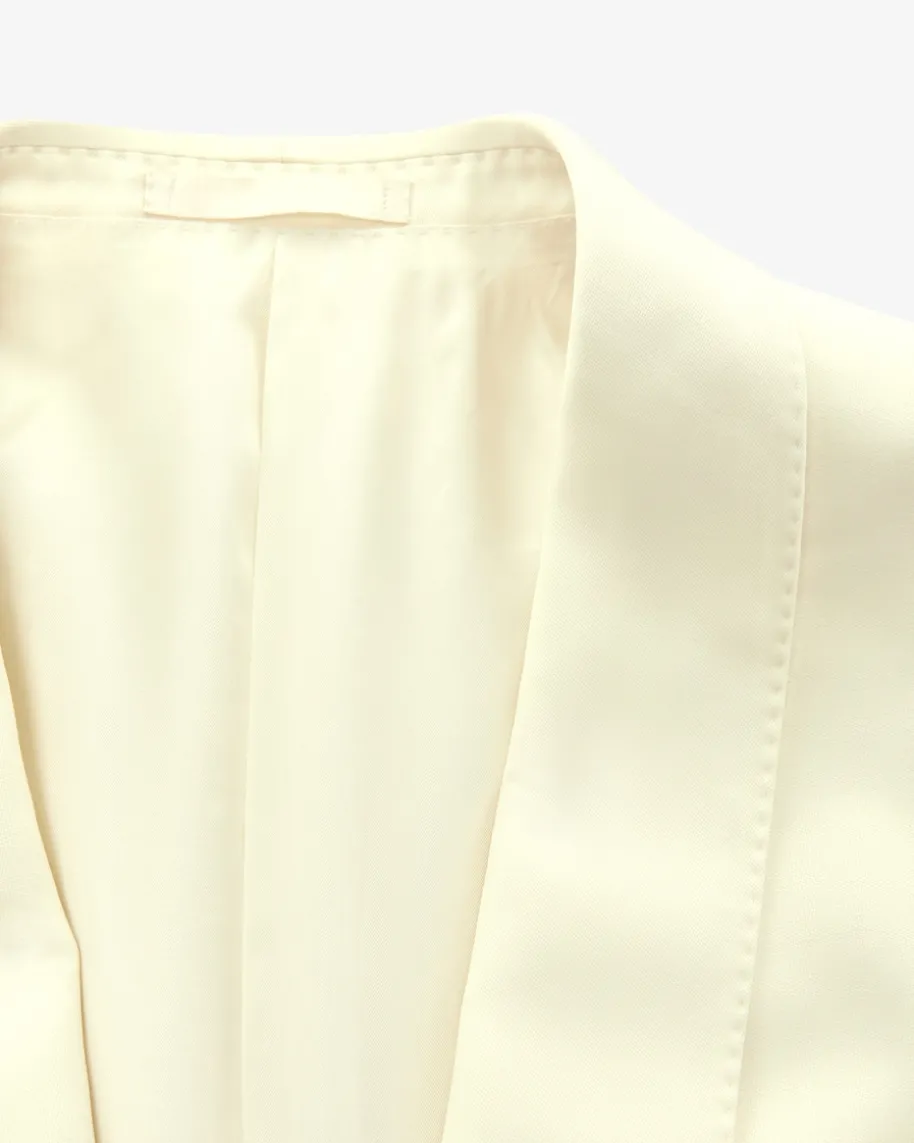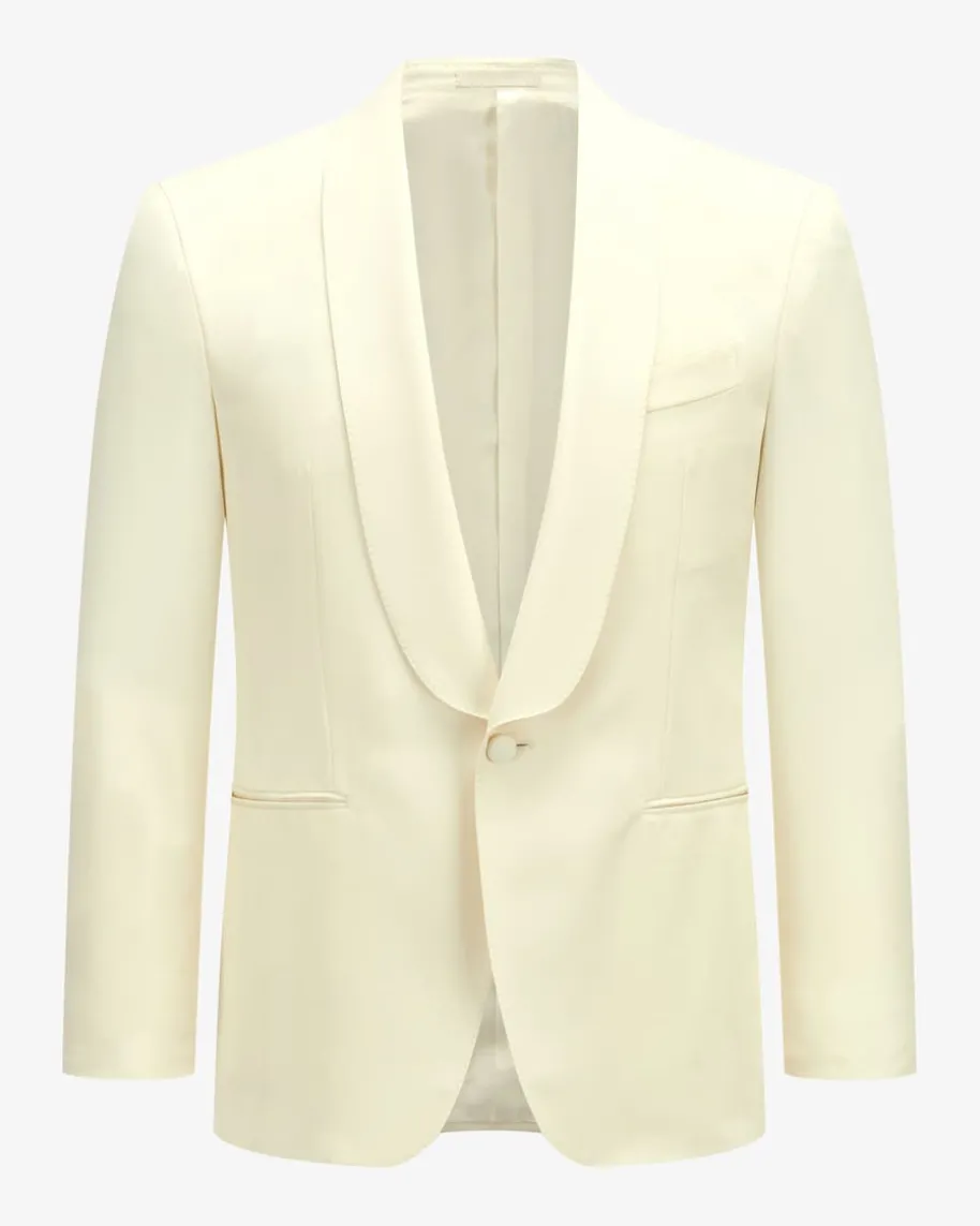 Smoking-Sakko für Herren von Caruso in Off-White. Gefertigt aus Wolle von LoroPiana – hergestellt in Italien. Das hochwertige Modell besticht mit besonderemSchalkragen sowie den mit Stoff überzogenen Knöpfen als eleganter Blickfang fürmaskuline Looks.