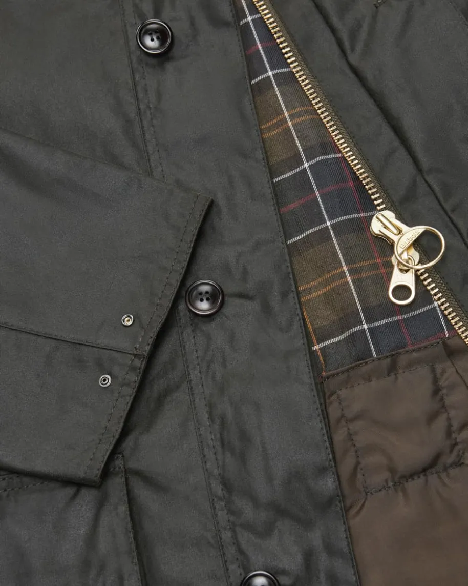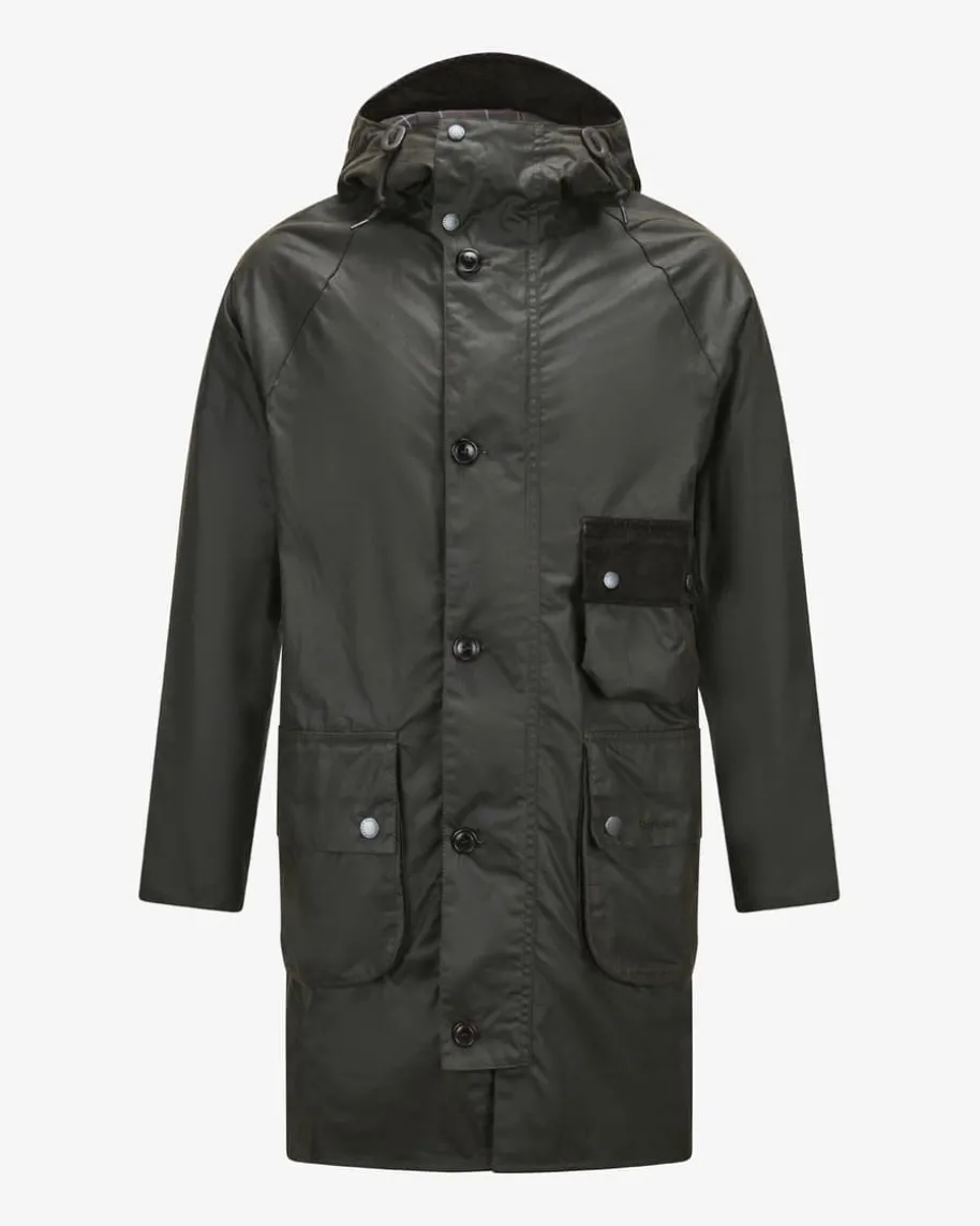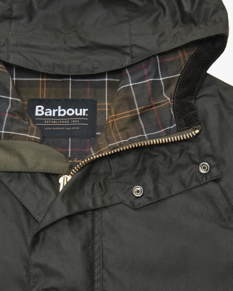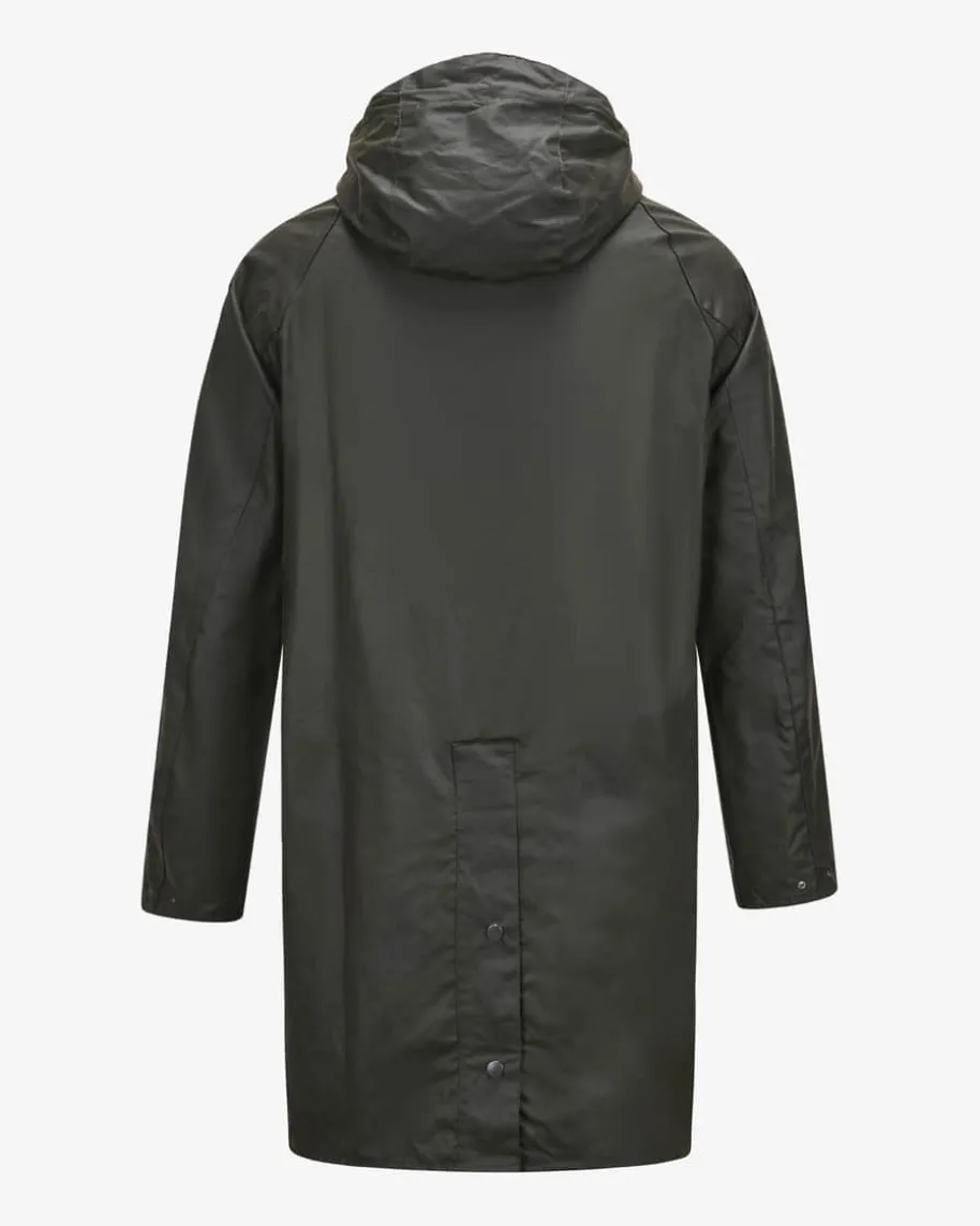 Solway Mantel für Herren von Barbour in Dunkeloliv. Das 1894 gegründetebritische Traditionshaus ist weltberühmt für gewachste Outdoorjacken mitHeritage-Flair. Auch dieses Modell präsentiert sich dank der gewachstenBaumwoll-Qualität mit labeltypischem Flair, während die weite Passform mithochgeschlossenem Kapuzenkragen und weitenverstellbaren Elementen einenmaskulinen Übergangs-Look kreiert.