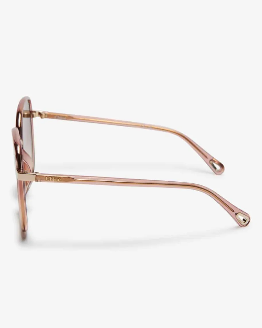 Sonnenbrille für Damen von Chloé Eyewear in Altrosa, Braun und Gold. Dankabgerundeter Gläser und der extragroßen Form mit schmalen Bügeln avanciert dasModell zum modernen Begleiter für den Sommer, während der semi-transparenteFarbverlauf den sonnigen Charakter gekonnt vollendet.