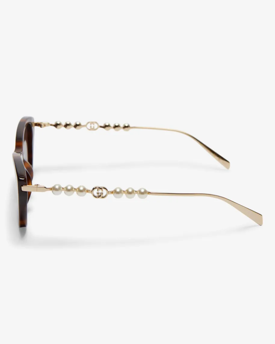 Sonnenbrille für Damen von Gucci Eyewear in Braun, Altrosa und Gold. Dankklassischer Cateye-Silhouette avanciert das Modell in Havana-Optik zum modernenBegleiter an sonnigen Tagen. Die schmalen, goldfarbenen Metallbügel mitchangierenden Schmuckperlen und charakteristischem Monogramm verleihen zugleichdas gewisse Etwas.