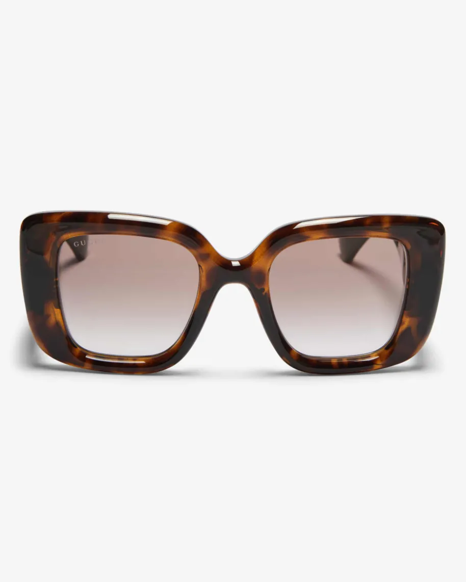 Sonnenbrille für Damen von Gucci Eyewear in Braun. Dank eckiger XL-Formavanciert das Modell mit breitem Rahmen in Havana-Optik zum extravagantenHingucker an sonnigen Tagen. Die seitlichen, goldfarbenen Logo-Applikationenrunden die Brille charakteristisch ab.