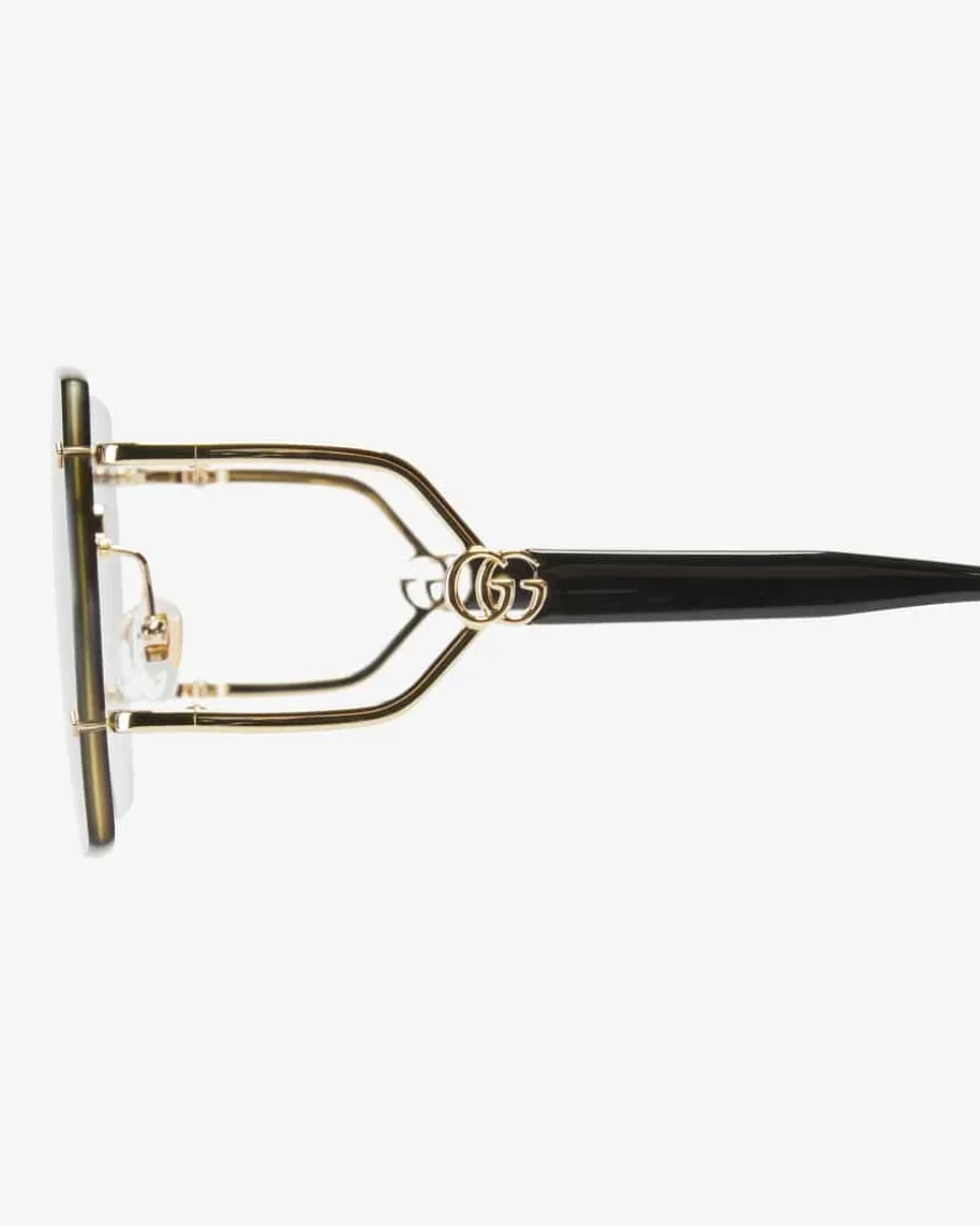 Sonnenbrille für Damen von Gucci Eyewear in Schwarz und Gold. Dank extravaganterFormgebung avanciert das extragroße, rahmenlose Modell zum perfekten Begleiterfür sonnige Tage. Zugleich setzt der leichte Farbverlauf in den Gläsernbesondere Akzente.