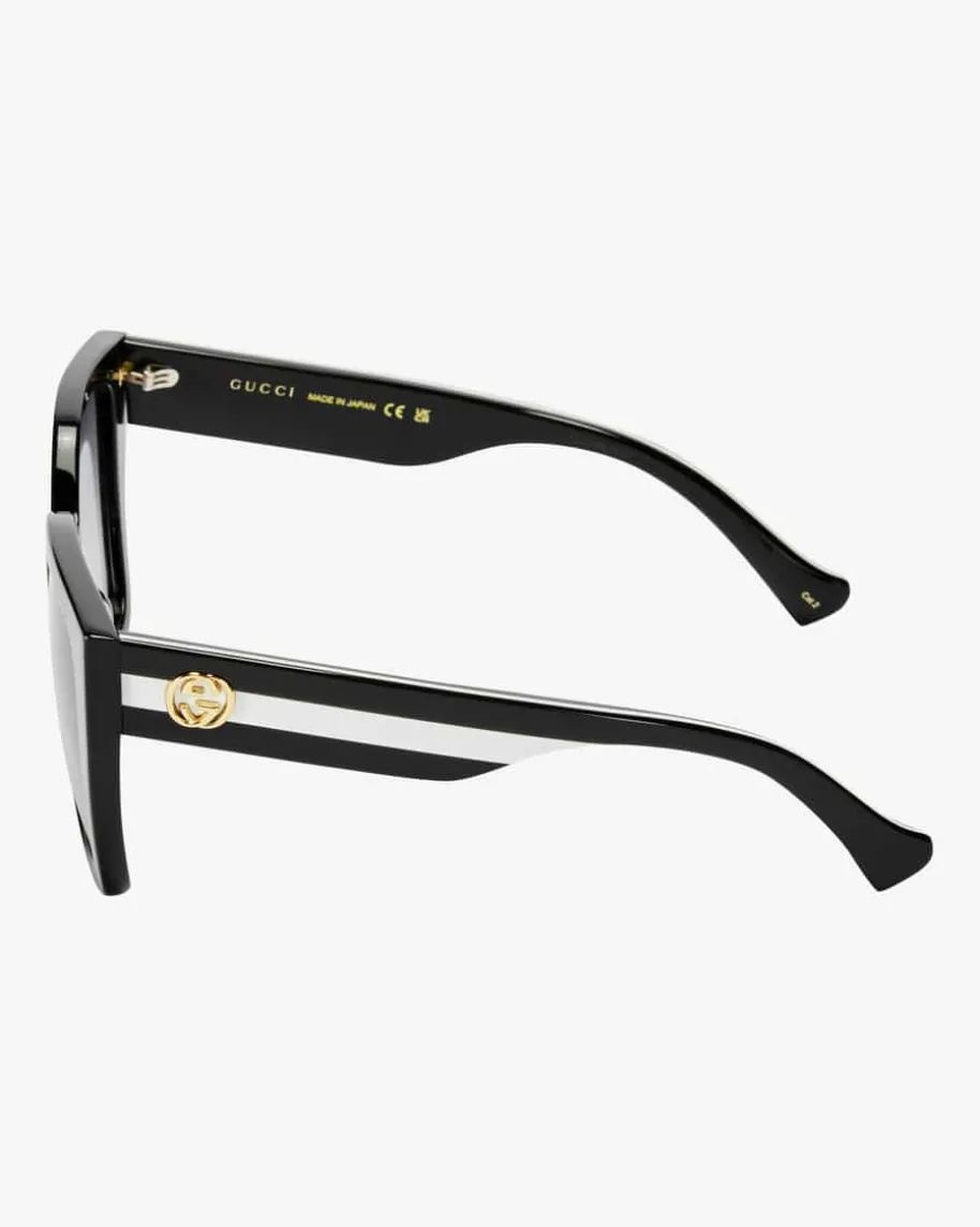 Sonnenbrille für Damen von Gucci Eyewear in Schwarz und Weiß. Dieses großeModell avanciert dank dem eckigen Rahmen sowie den hell getönten Gläsern zummodischen Begleiter für stilvolle Looks. Zugleich runden die goldfarbenen Logo-Applikationen sowie der Kontrast-Streifen an den Bügeln den Look gekonnt ab.