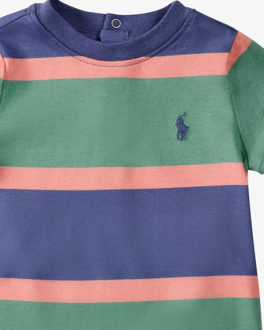 Spieler für Babys von Polo Ralph Lauren in Grün, Altrosa und Dunkelblau. DasModell präsentiert sich in komfortabler Jersey-Qualität mit kurzen Beinchen alsniedlicher Einteiler für Ihr Kleines, während das Streifenmuster zusammen mitder Logo-Stickerei den letzten Schliff verleiht.
