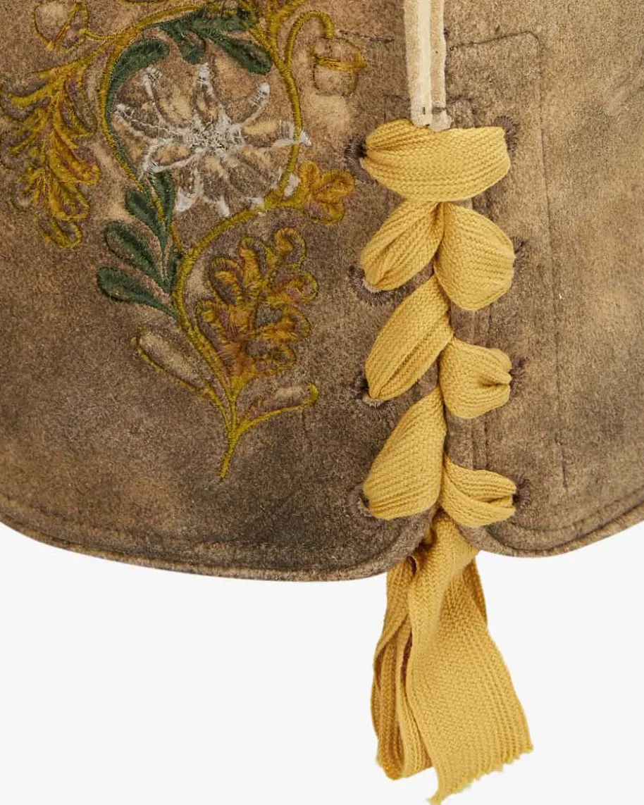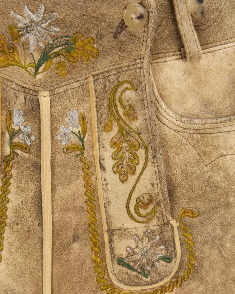 Spitzingsee Lederhose für Herren von Meindl in Beige. Aus hochwertigen Leder gefertigt und mit traditionellen Stickereien überzeugt das Modell in modischen Used-Look. Ein geknöpfter Latz sowie Schnürungen auf der Rückseite als auch seitlich des Hosenbeines sorgen für hohen Tragekomfort. Drei charakteristische Taschen sowie markante Paspeln vollenden das Design gekonnt.