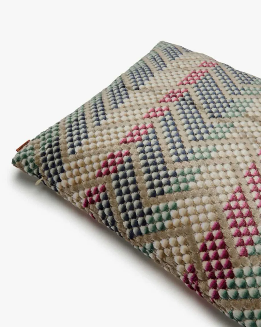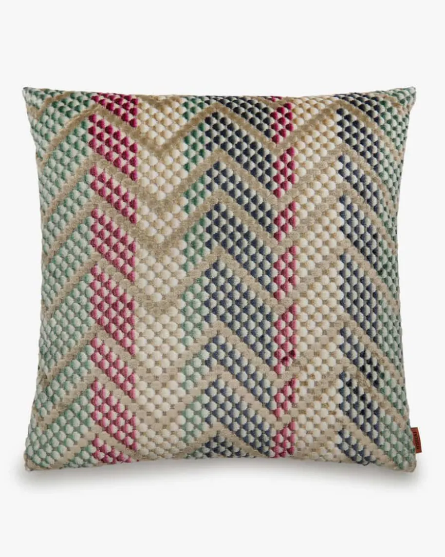 Squame Kissen von Missoni Home in Violett, Türkis und Himbeere. Ein originellerHingucker in Ihrem Zuhause – Das Modell überzeugt durch sein unverwechselbaresZick-Zack-Muster in fließenden Farben und Nuancen, die an die Harmonie der Naturerinnern. Zugleich sorgt die spezielle Material-Verarbeitung für einen besondersweichen Griff.