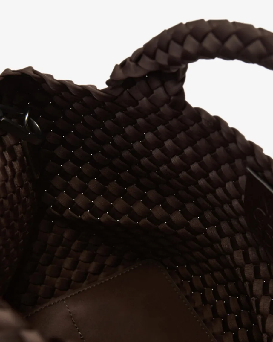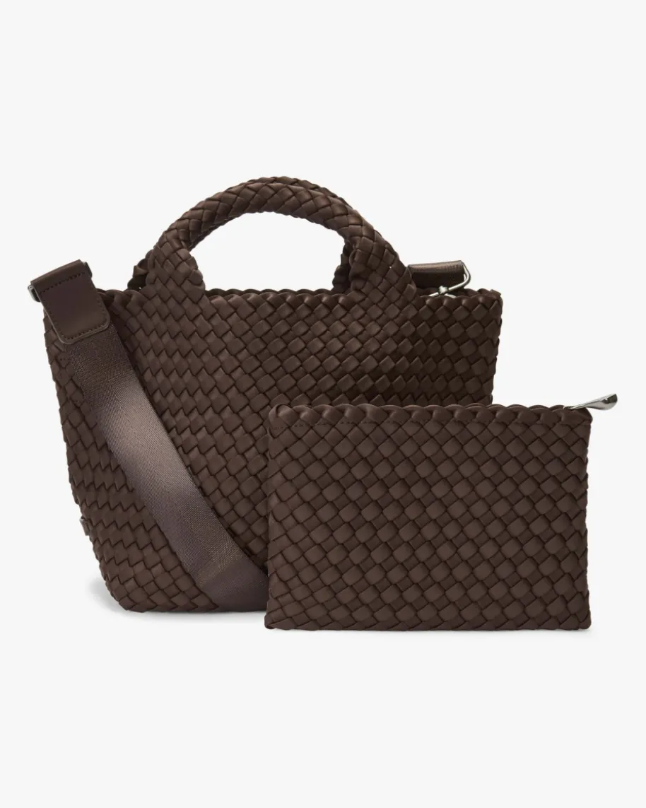St. Barths Small Tote Handtasche für Damen von Naghedi in Schoko. Dieses textileModell präsentiert sich in changierender Optik und edler Flecht-Aufmachung,während das cleane Design für einen zeitlosen Look sorgt. Die separate Clutchist mit einem Reißverschluss versehen und bietet Platz für Ihre Kosmetikartikeloder andere Kleinigkeiten.