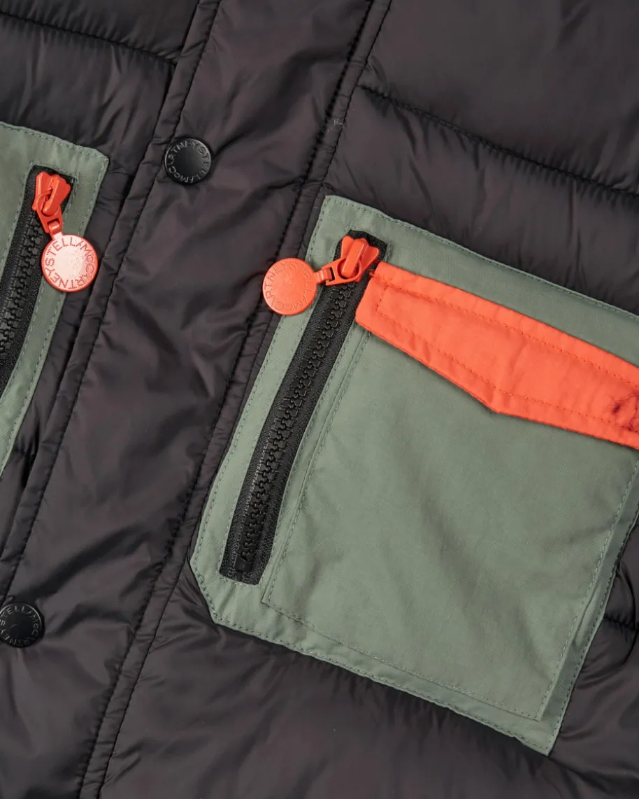 Steppjacke für Jungen von Stella McCartney Kids in Schwarz, Orange und Graugrün.Stella McCartney Kids steht für fröhliche und langlebige Kindermode, die unterethischen und ökologischen Gesichtspunkten hergestellt wird. Auch diesessportive Modell punktet mit kontrastfarbenen Brusttaschen, während dasklassische Steppmuster mit voluminöser Wattierung angenehm wärmende Tragemomentegarantiert.