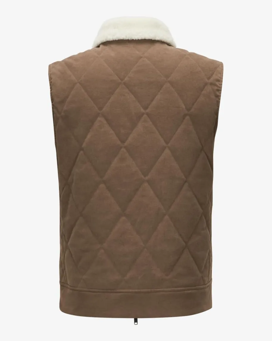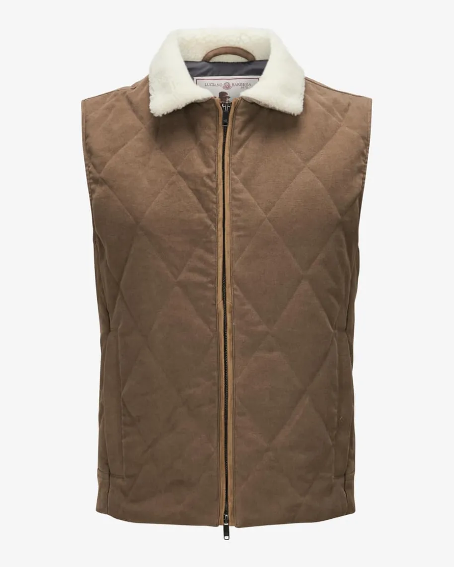 Weste für Herren von Luciano Barbera in Kastanie. Das Modell präsentiert sich inRauten-Steppmuster und Schaffell-Besatz und avanciert dank der klassischenAufmachung zu einem modernen Begleiter für die Übergangszeit.