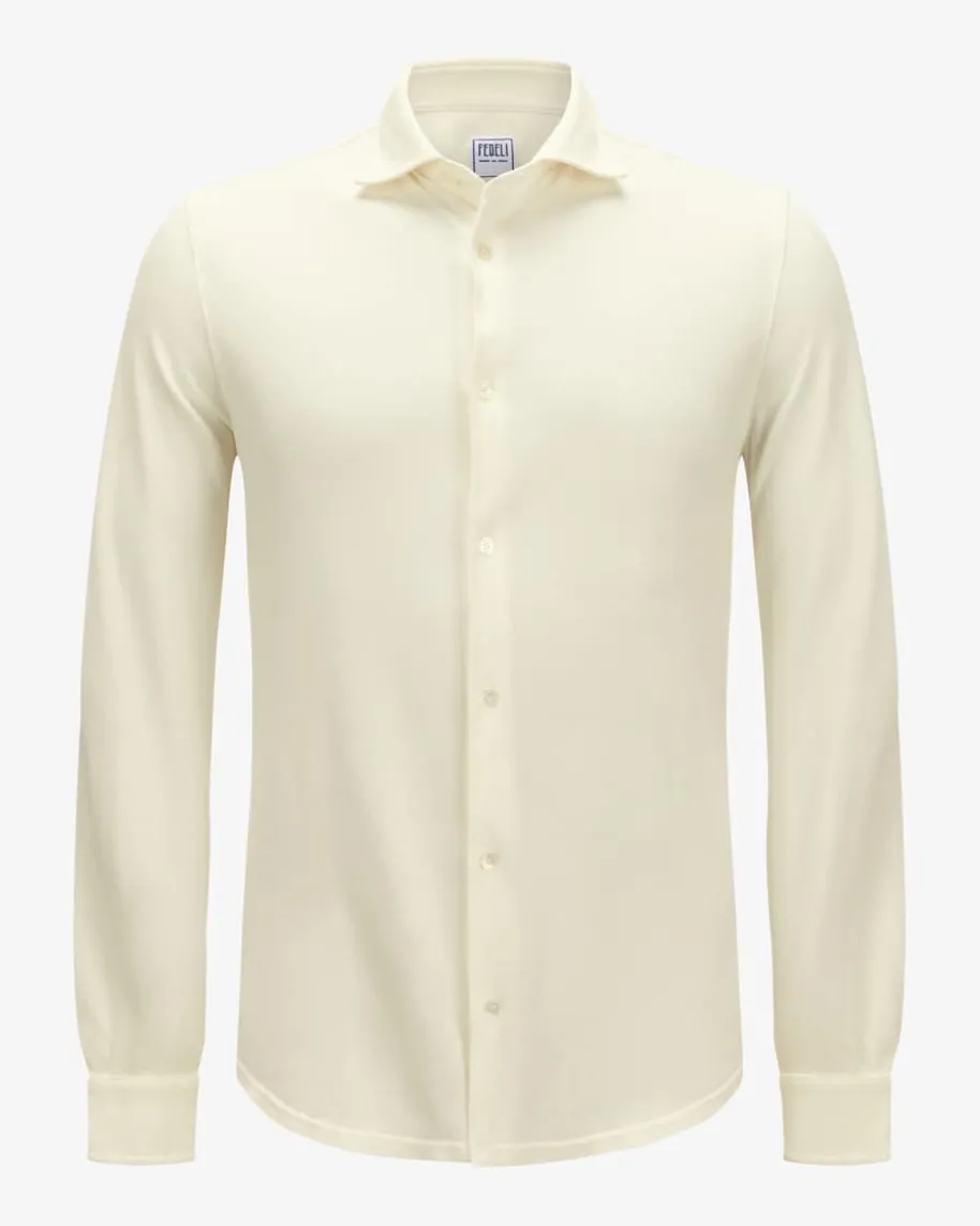 Steve ML Jerseyhemd für Herren von Fedeli in Ecru. Zeitlos und legerzugleich präsentiert sich das Modell mit tailliertem Schnitt undhochwertiger Piqué-Qualität, während perlmuttfarbene Knöpfe den letzten Schliffverleihen.