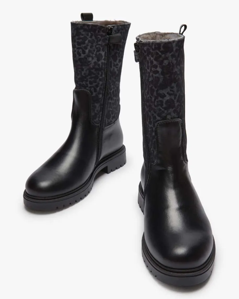 Stiefel für Mädchen von Cole Bounce Restore in Schwarz. Das Modell begeistertdank der hochwertigen Leder-Kombination, während die weiche Schaffell-Innenseitewärmende Tragemomente verspricht. Zugleich setzt der Leo-Print modische Akzente.