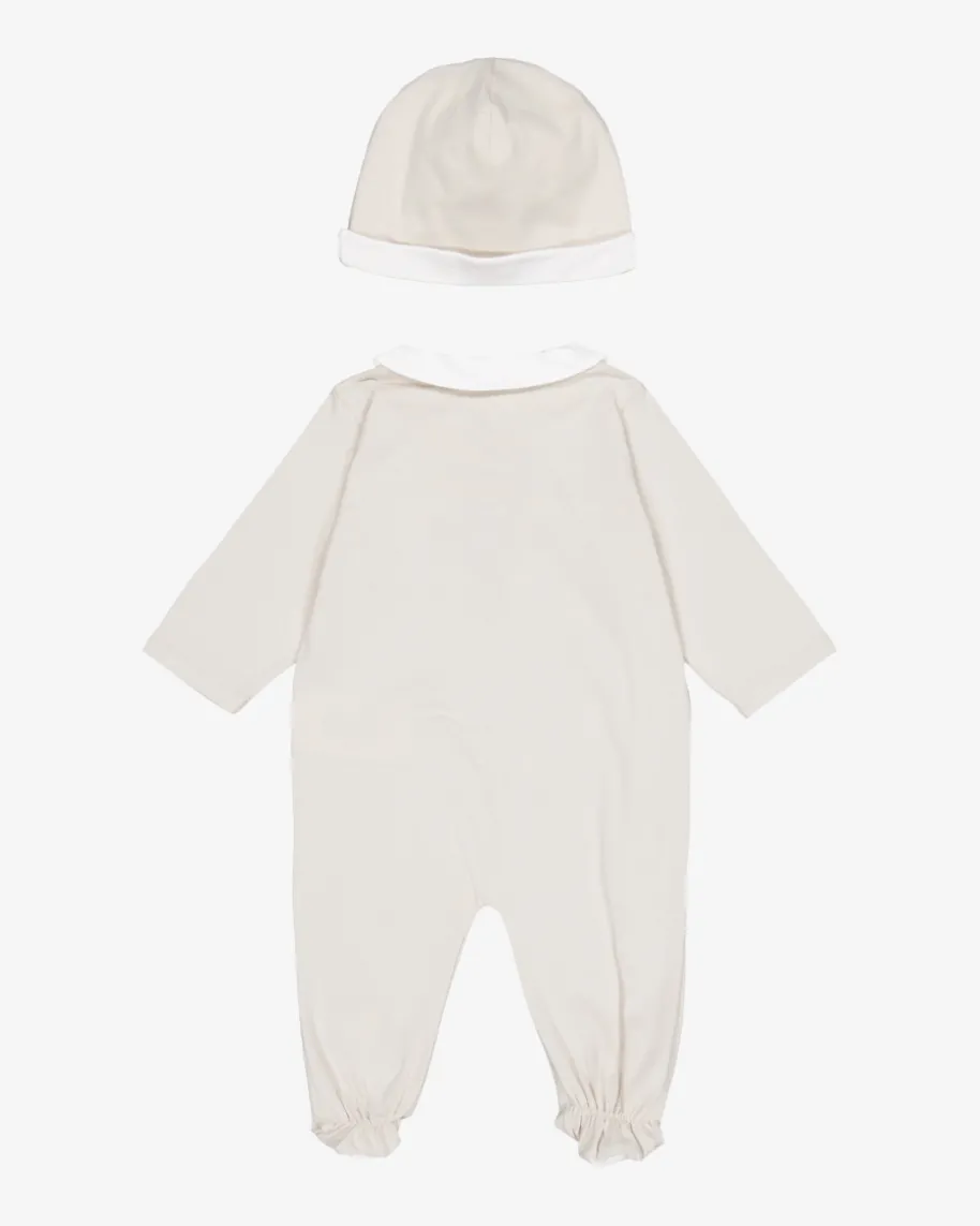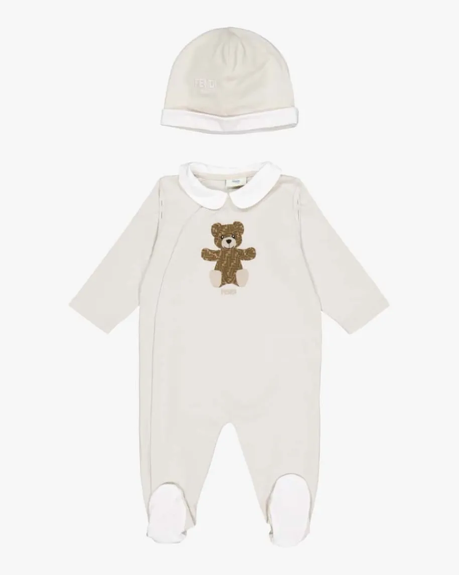 Strampler mit Mütze für Babys von Fendi Kids in Beige. Das Modell präsentiertsich dank dem kontrastierenden Bubi-Kragen in niedlicher Aufmachung, während dieweiche Baumwoll-Qualität für angenehme Tragemomente sorgt. Zugleich runden dieBärchen-Applikation sowie die Mütze den Look gekonnt ab.