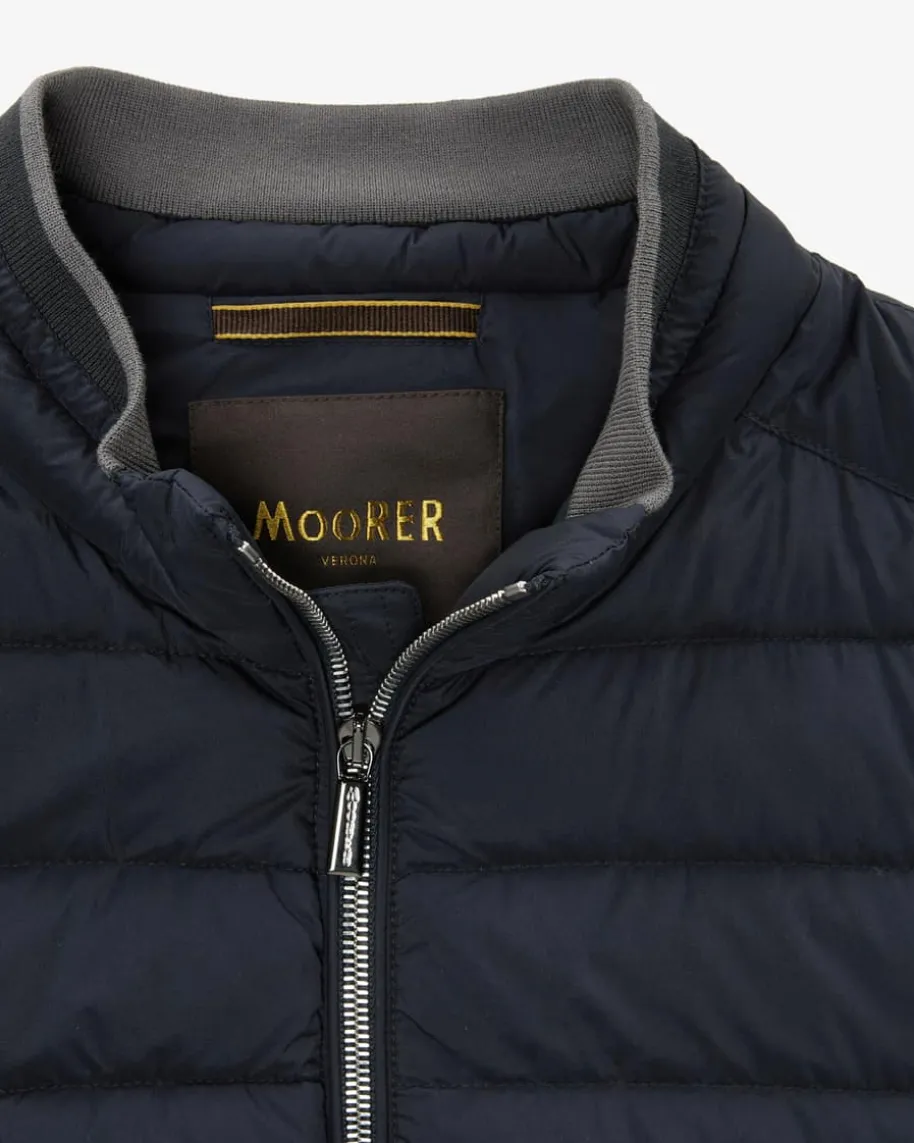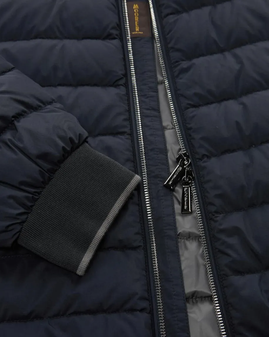 Strauss Daunenjacke für Herren von Moorer in Dunkelblau. DasModell mitchangierender Stepp-Optik überzeugt dank der hochwertigenDaunen-Feder-Füllungmit optimaler Wärmeisolierung, während Rippstrick-Detailseinen sportivenBlouson-Look kreieren.