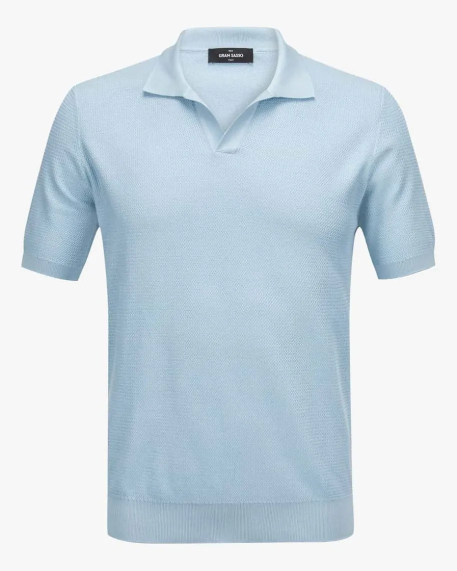 Strick-Poloshirt für Herren von Gran Sasso in Hellblau. Das fein gestrickteModell überzeugt mit der leichten Seiden-Baumwoll-Qualität, während die modischeWeb-Struktur dem Gesamtbild eine extravagante Note verleiht.