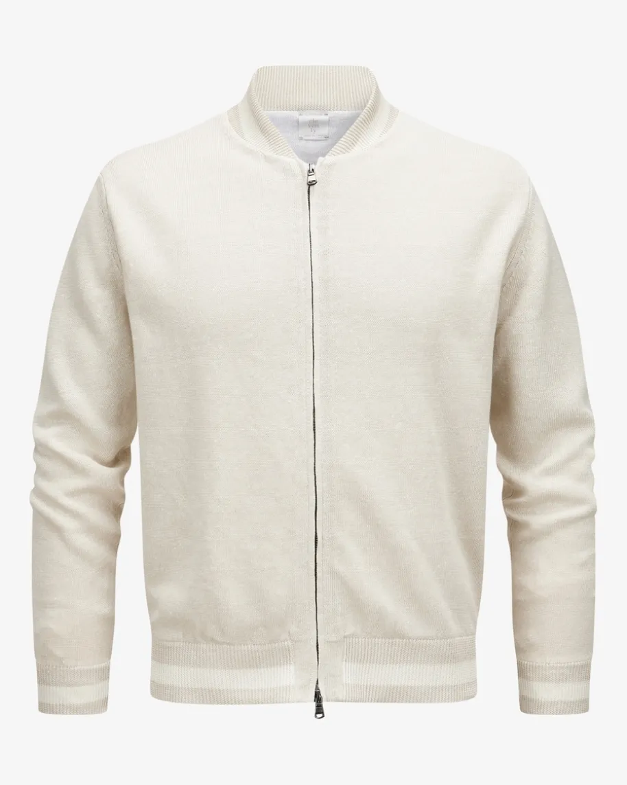 Strickblouson für Herren von Eleventy in Sand und Off-White. Das Modell bestichtdank der doppellagige Strickverarbeitung aus Leinen-Baumwoll-Mix sowohl haptischals auch optisch, während die Kombination aus legerem Strickjacken-Look undmodischer Blousonjacken-Aufmachung mit gestreiften Rippstrick-Bündchen einenvielseitigen Casual-Begleiter kreiert.