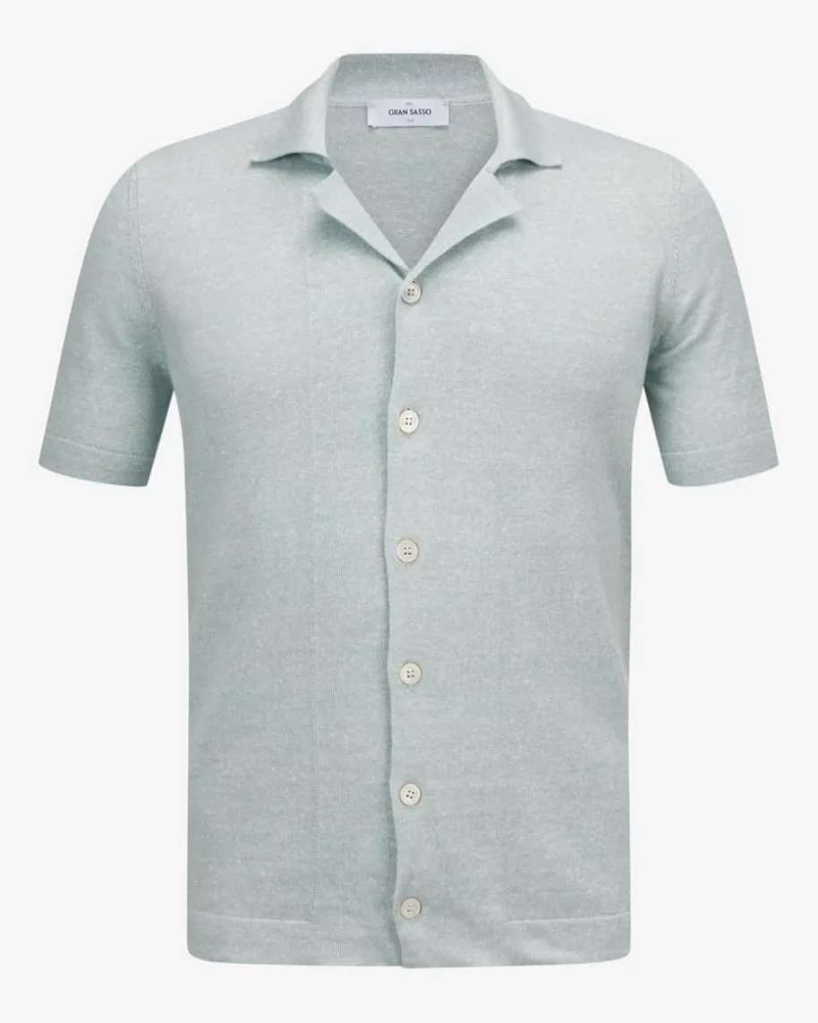 Strickhemd für Herren von Gran Sasso in Türkis. Das Kurzarm-Modell zeichnet sichdurch die hochwertige Leinen-Baumwoll-Verarbeitung aus, während die melierteAufmachung den angesagten Bowling-Look harmonisch ergänzt.