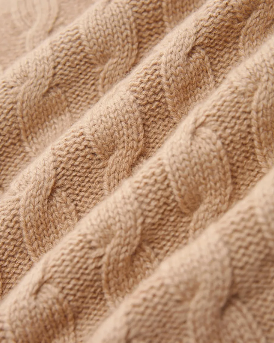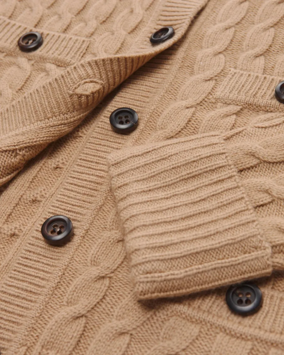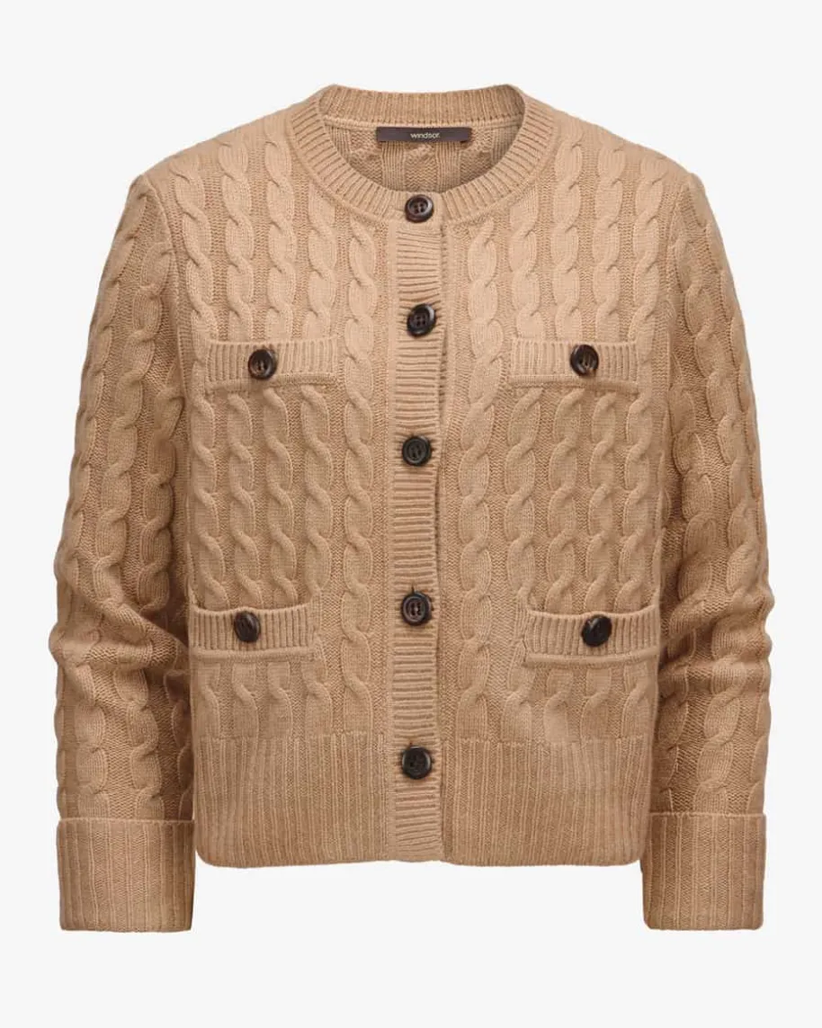 Strickjacke für Damen von Windsor in Camel. Während der hochwertige Schurwoll-Cashmere-Mix eine angenehme Haptik verleiht, kreieren das Zopfstrick-Mustersowie die umgeschlagenen Ärmelbündchen einen modernen Casual-Favoriten. Zugleichsorgt das Pocket-Design zusammen mit der Schulterwattierung für einen besonderenTwist.
