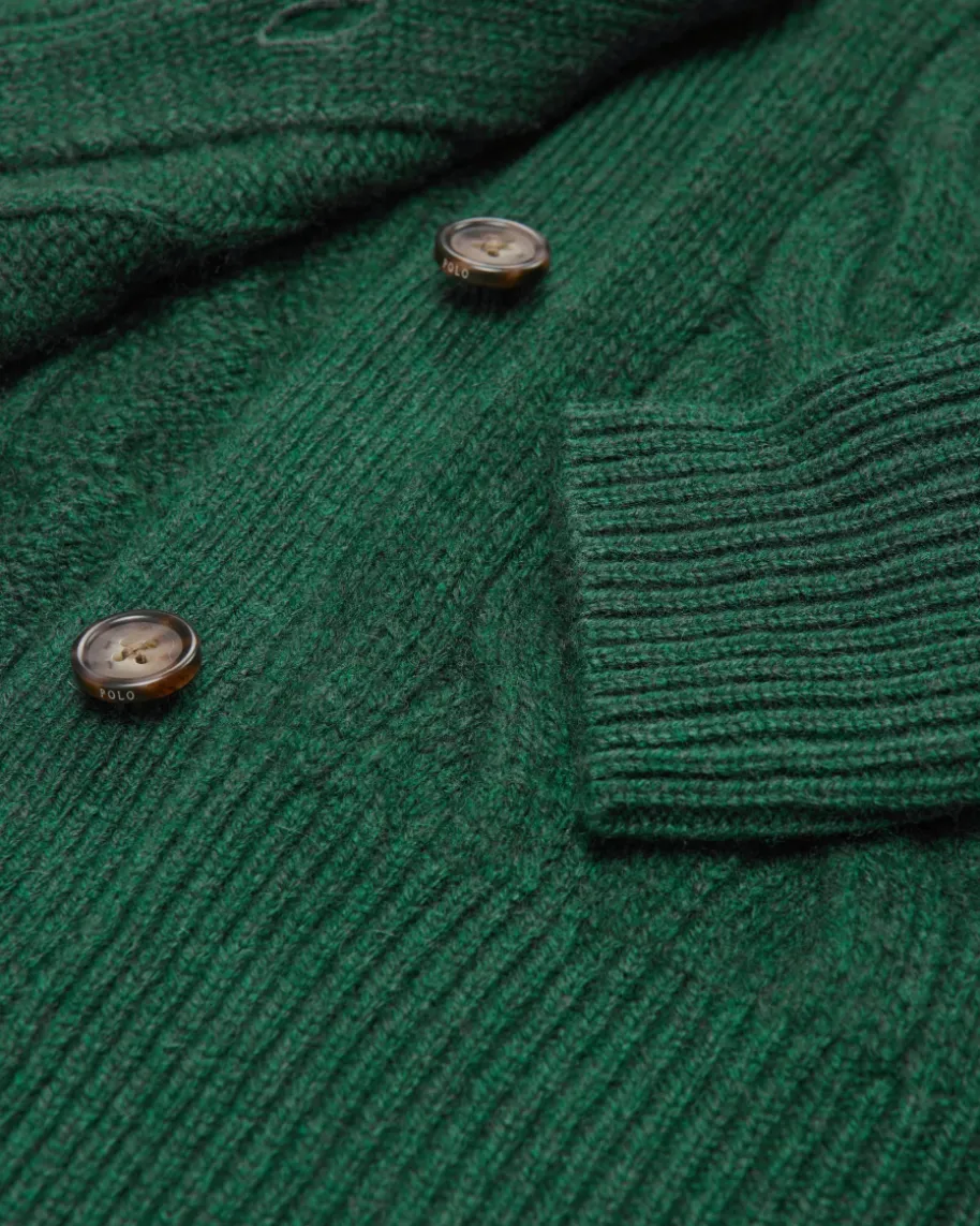 Strickjacke für Damen von Polo Ralph Lauren in Flaschengrün. Qualität,Lifestyle,Authentizität und zeitlose Eleganz – all das zeichnet die Marke Polo RalphLauren seit nunmehr 50 Jahren Firmengeschichte aus. Das Modell begeistert durchden besonders weichen Wolle-Cashmere-Mix mit hohem Tragekomfort. Stilvollabgerundet wird das Design durch die kontrastierende Logo-Stickerei auf derBrust sowie das klassische Zopf-Strickmuster.