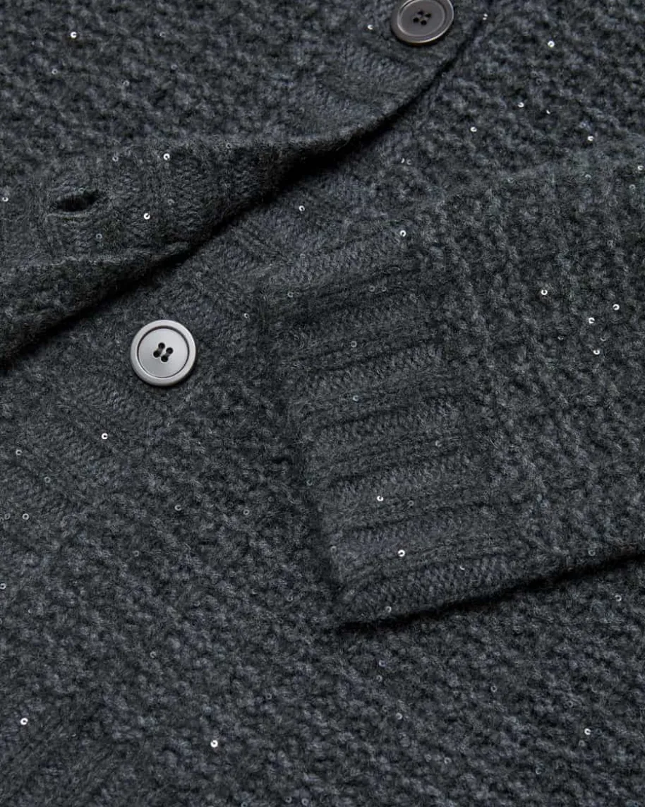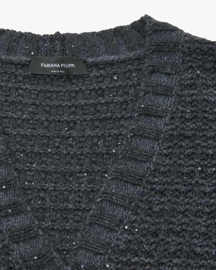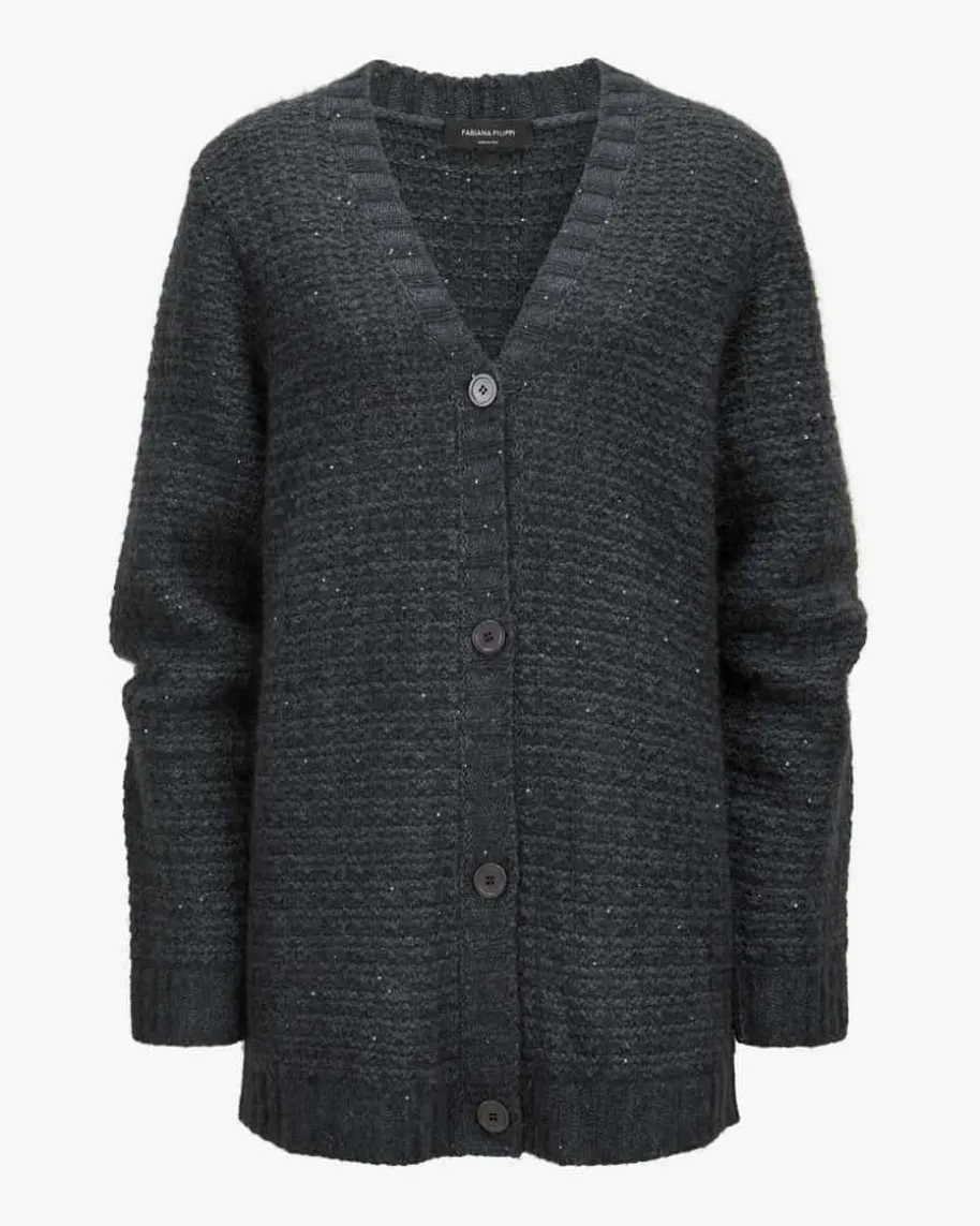 Strickjacke für Damen von Fabiana Filippi in Anthrazit. Das legere, langgeschnittene Modell präsentiert sich in dickem Gitterstrick-Design aus weichemMerinowoll-Seiden-Mix, während die zarten Pailletten-Applikationen einenfemininen Touch verleihen.