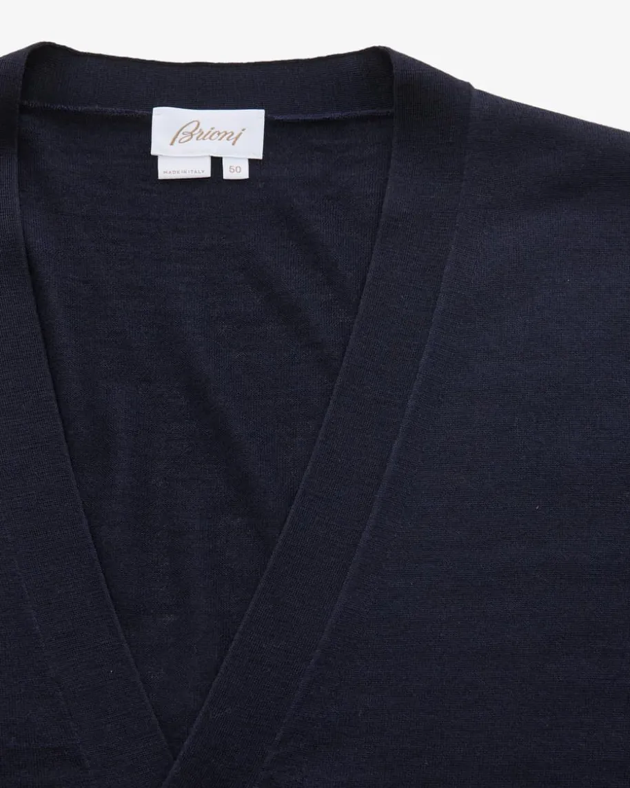 Strickjacke für Herren von Brioni in Navy. Dieses Modell überzeugt sowohlhaptisch als auch optisch mit besonders hochwertiger Material-Qualität, währendder klassische Look ein zeitloses Must-Have schafft. Die changierenden Perlmutt-Knöpfe setzen zudem modische Akzente.