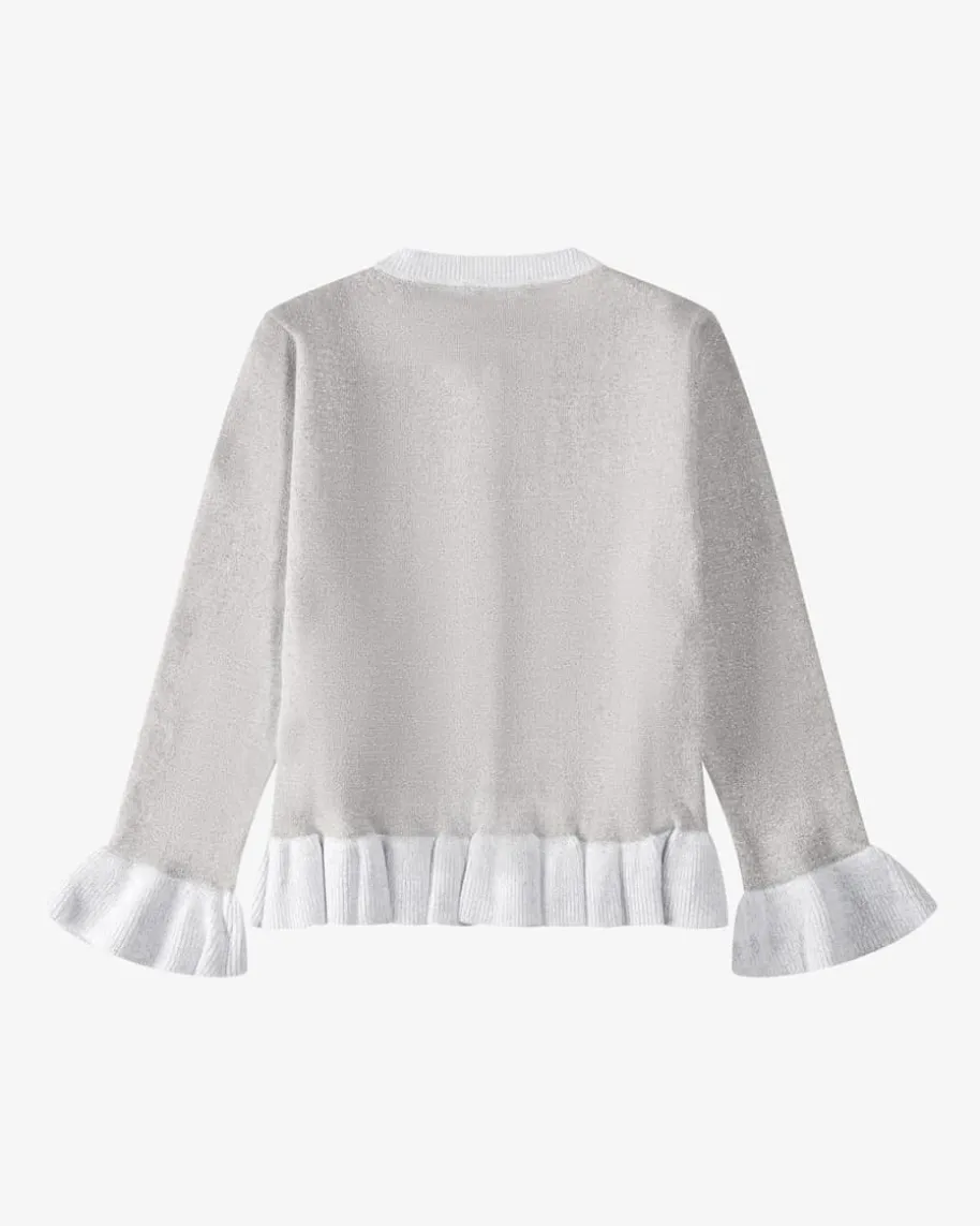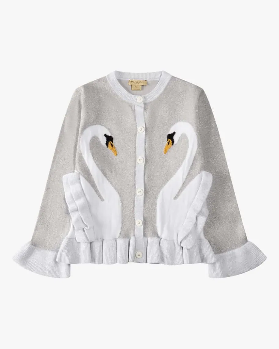 Strickjacke für Mädchen von Stella McCartney Kids in Silber, Weiß und Gelb. DasModell aus nachhaltigem Baumwoll-Mix begeistert dank changierenden Glitzerfasernsowie eingearbeiteter Schwanen-Intarsien und süßen Rüschen-Details – Einniedlicher Begleiter für Ihre Kleine.