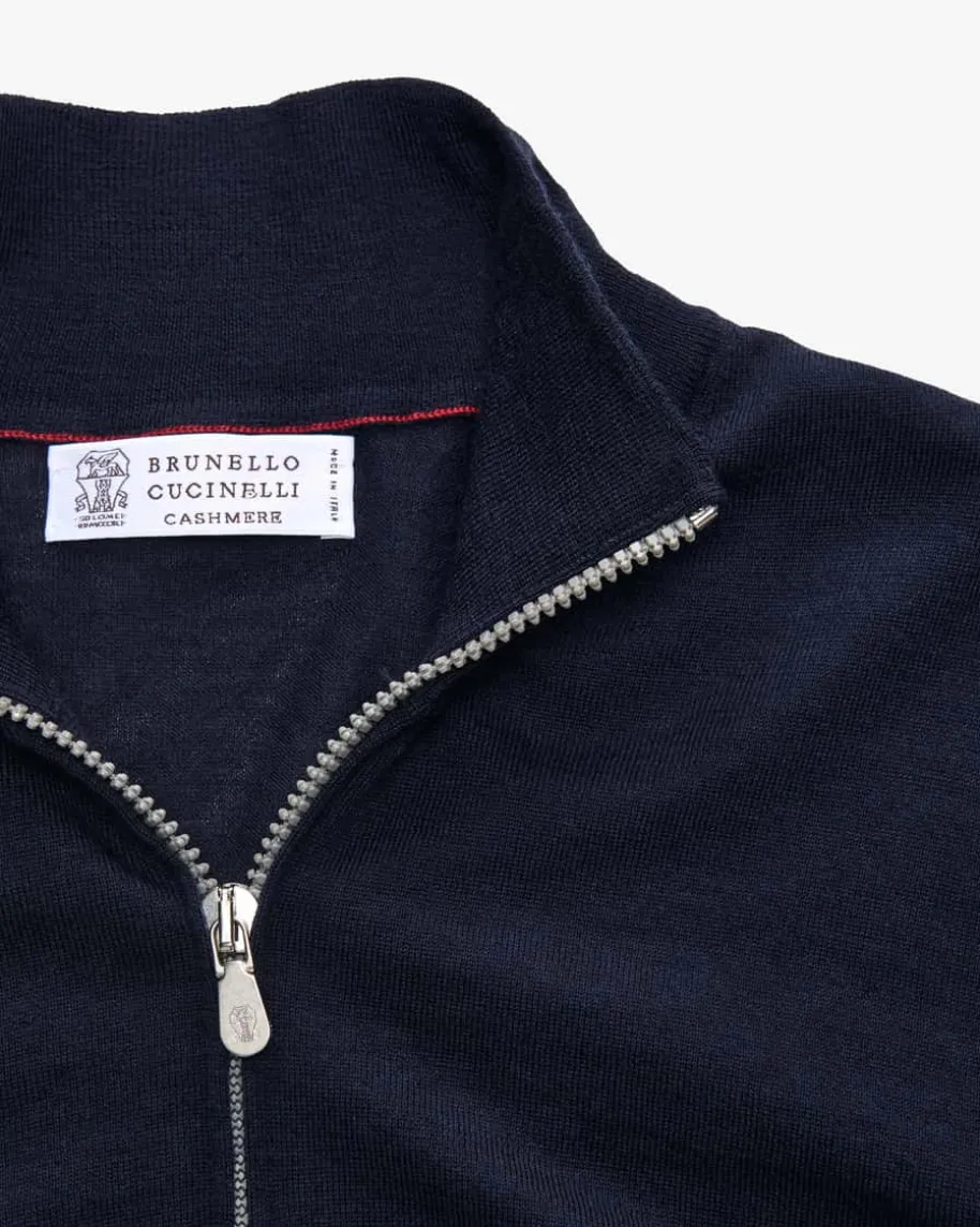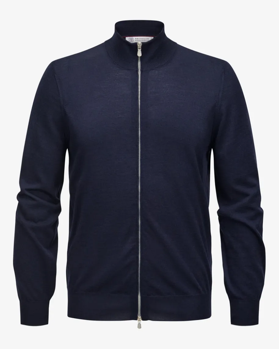 Strickjacke für Herren von Brunello Cucinelli in Navy. Das italienischeLabelist bekannt für außergewöhnliche Kreationen, die sowohl zeitlos als auchpuristisch sind. Das clean gehaltene Modell aus einem hochwertigen Woll-Cashmere-Mix wird dank kontrastierenden Paspelierungen elegant ergänzt.