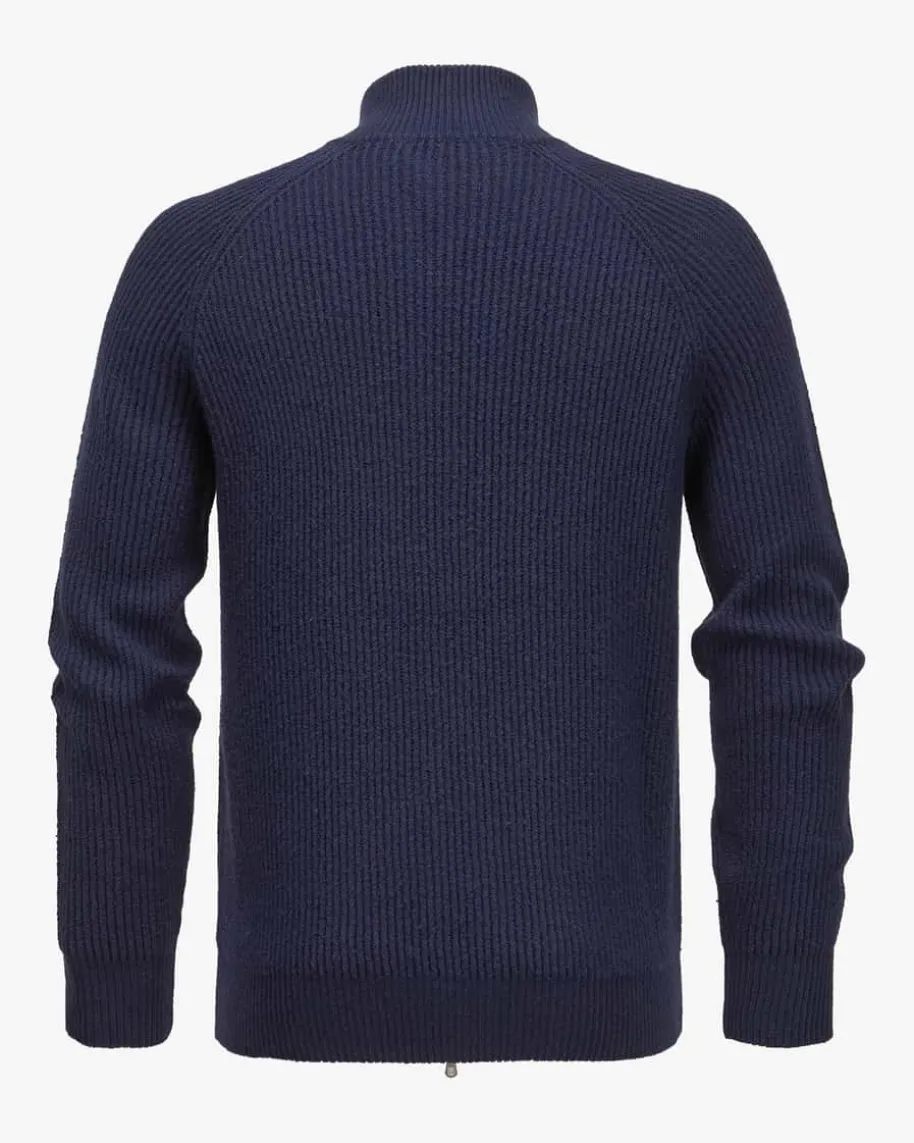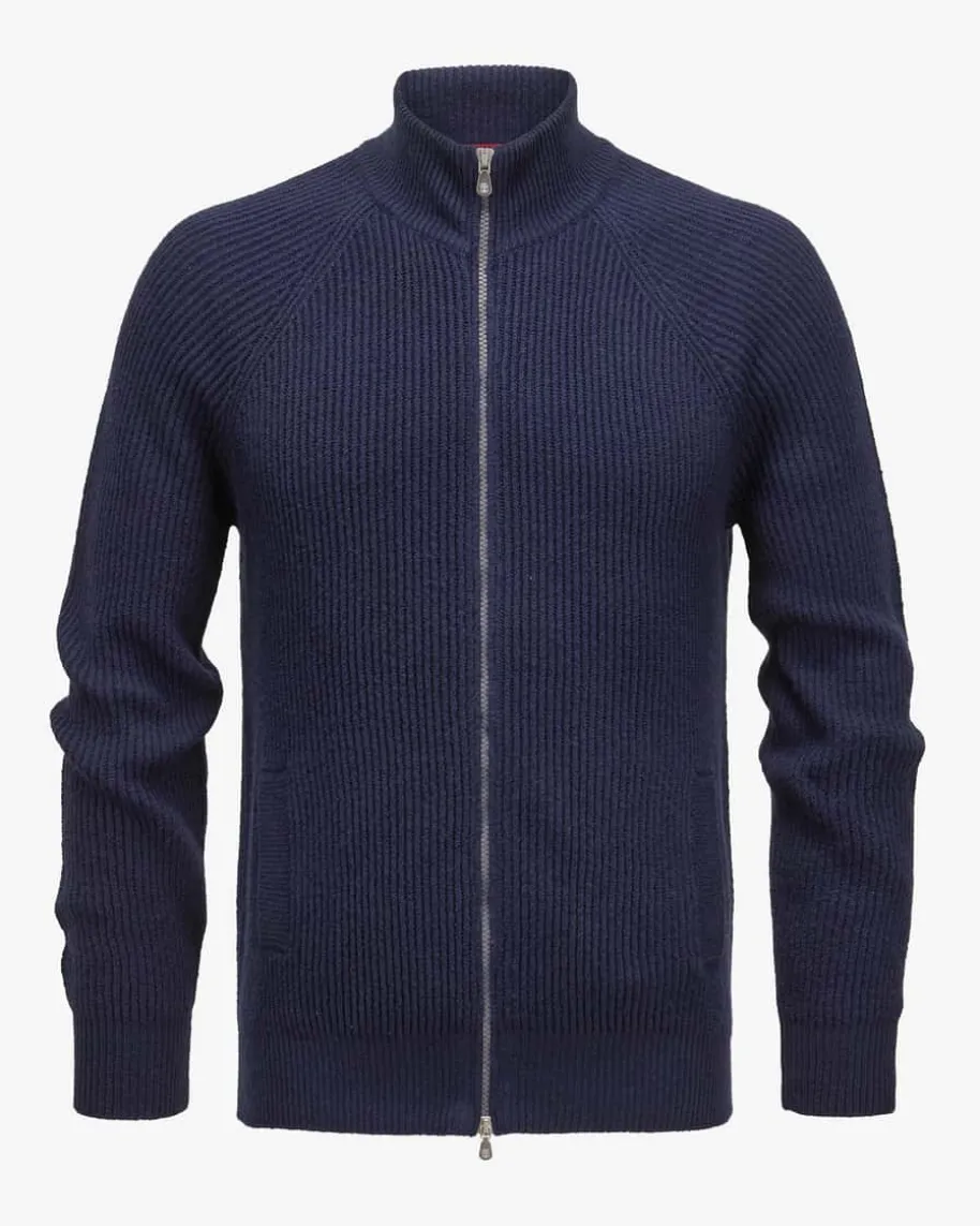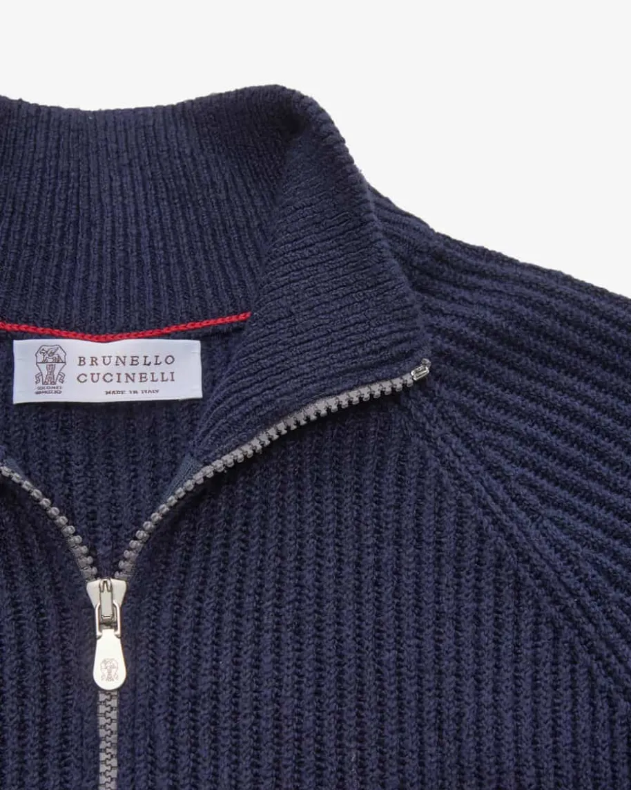 Strickjacke für Herren von Brunello Cucinelli in Dunkelblau. Das Stehkragen-Modell aus weicher Baumwoll-Verarbeitung überzeugt mit zeitlos-modernemRippstrick-Design und zulaufenden Bündchen, wodurch ein hochwertiges Herbst-Essential entsteht.