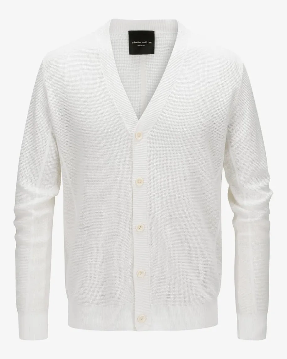 Strickjacke für Herren von Roberto Collina in Creme. Das Modell zeichnet sichbesonders durch seine grobmaschige Strick-Aufmachung aus, welche fürsemitransparente Momente sorgt. Zusammen mit dem geradlinigen Schnitt entstehtein modischer Strick-Favorit für Ihre Casual-Garderobe.