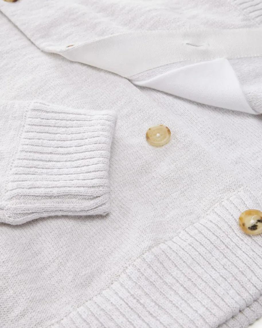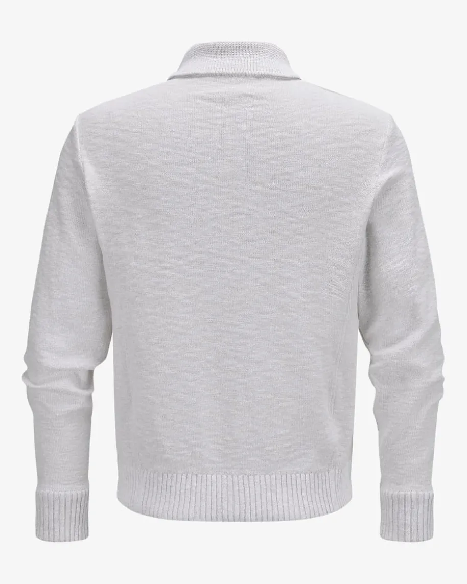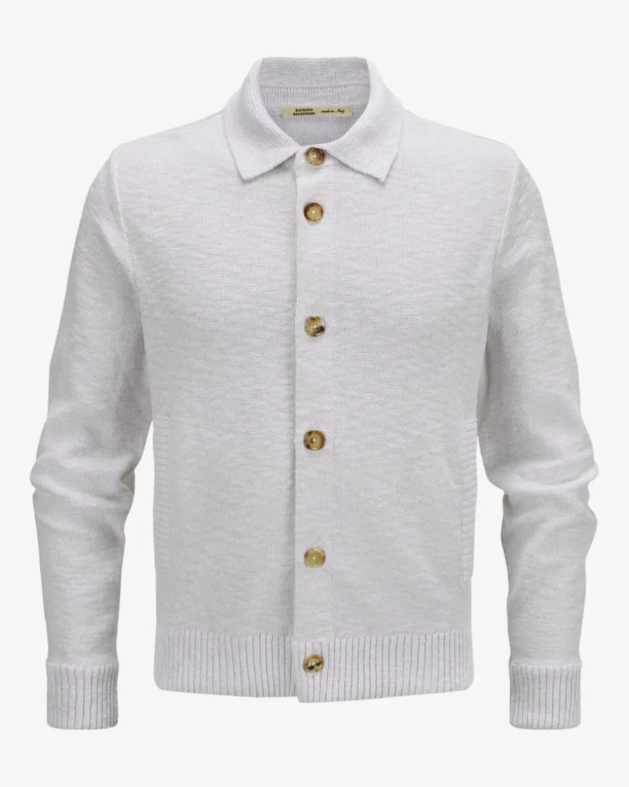 Strickjacke für Herren von Maurizio Baldassari in Off-White.Das Modell bestichtdurch die Baumwoll-Strickverarbeitung mit einerstrukturierten Haptik, währendder Umlegekragen sowie die breiten Rippstrick-Bündchen einenmodernen Casual-Begleiter kreieren.