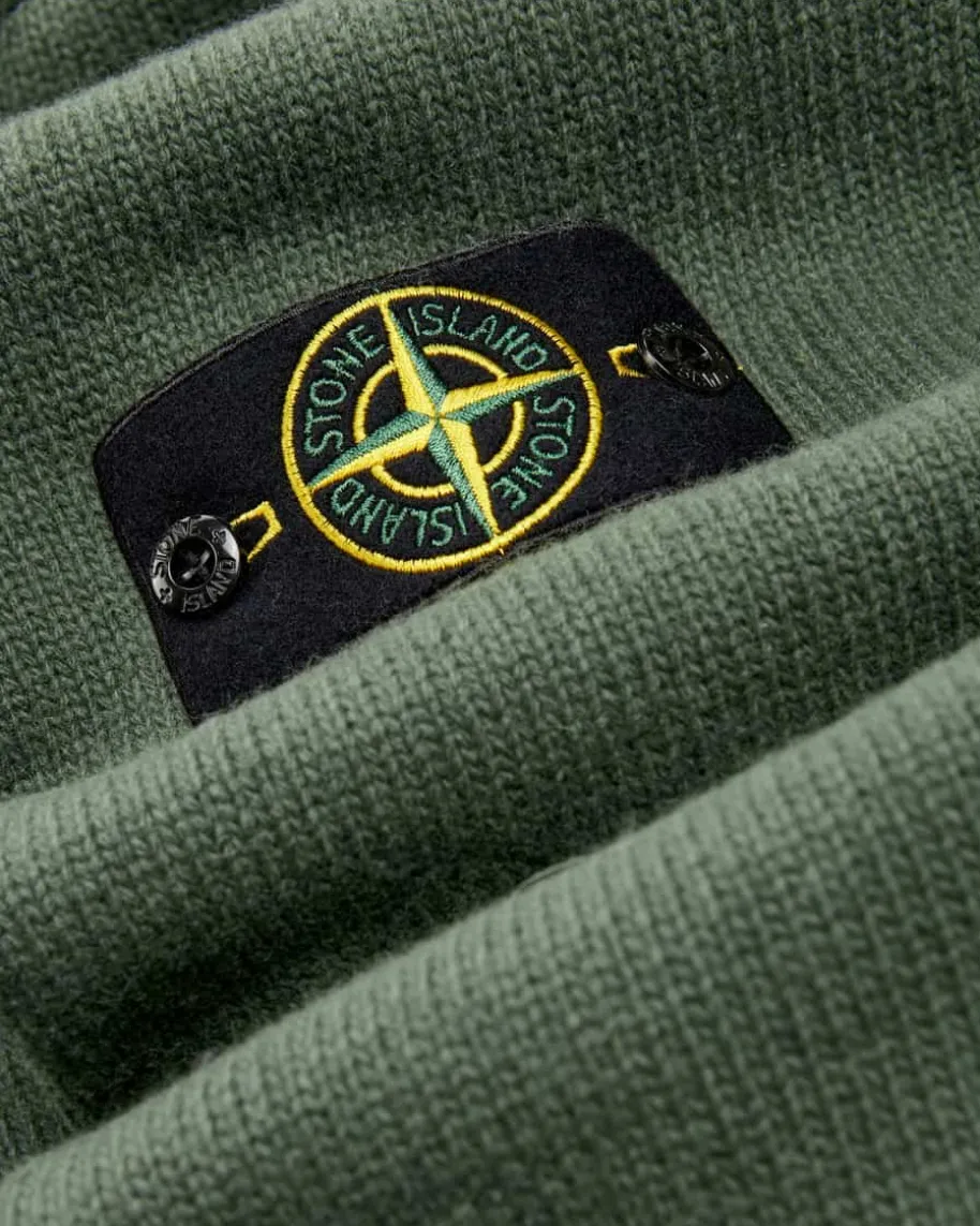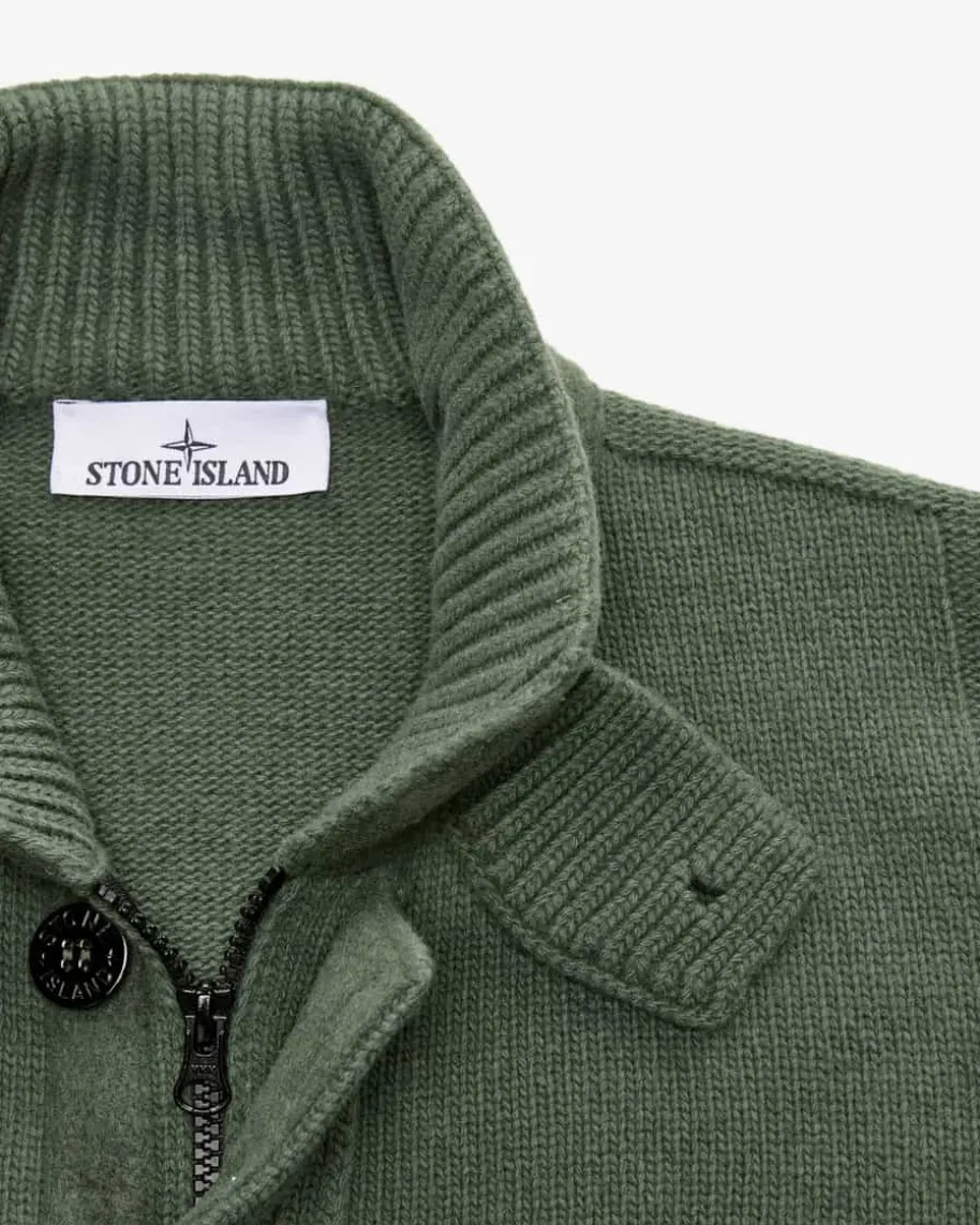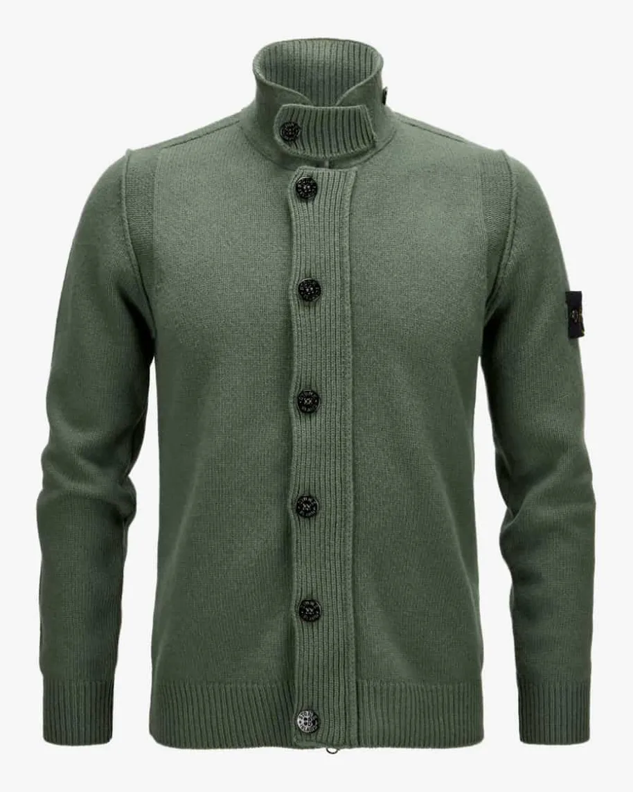 Strickjacke für Herren von Stone Island in Oliv. Während das klassische Strick-Design mit hohem Stehkragen und Filz-Besatz zusammen mit dem doppeltenVerschluss einen maskulinen Look kreiert, rundet die labeltypische Logo-Plaketteam Ärmel das Gesamtbild gekonnt ab.