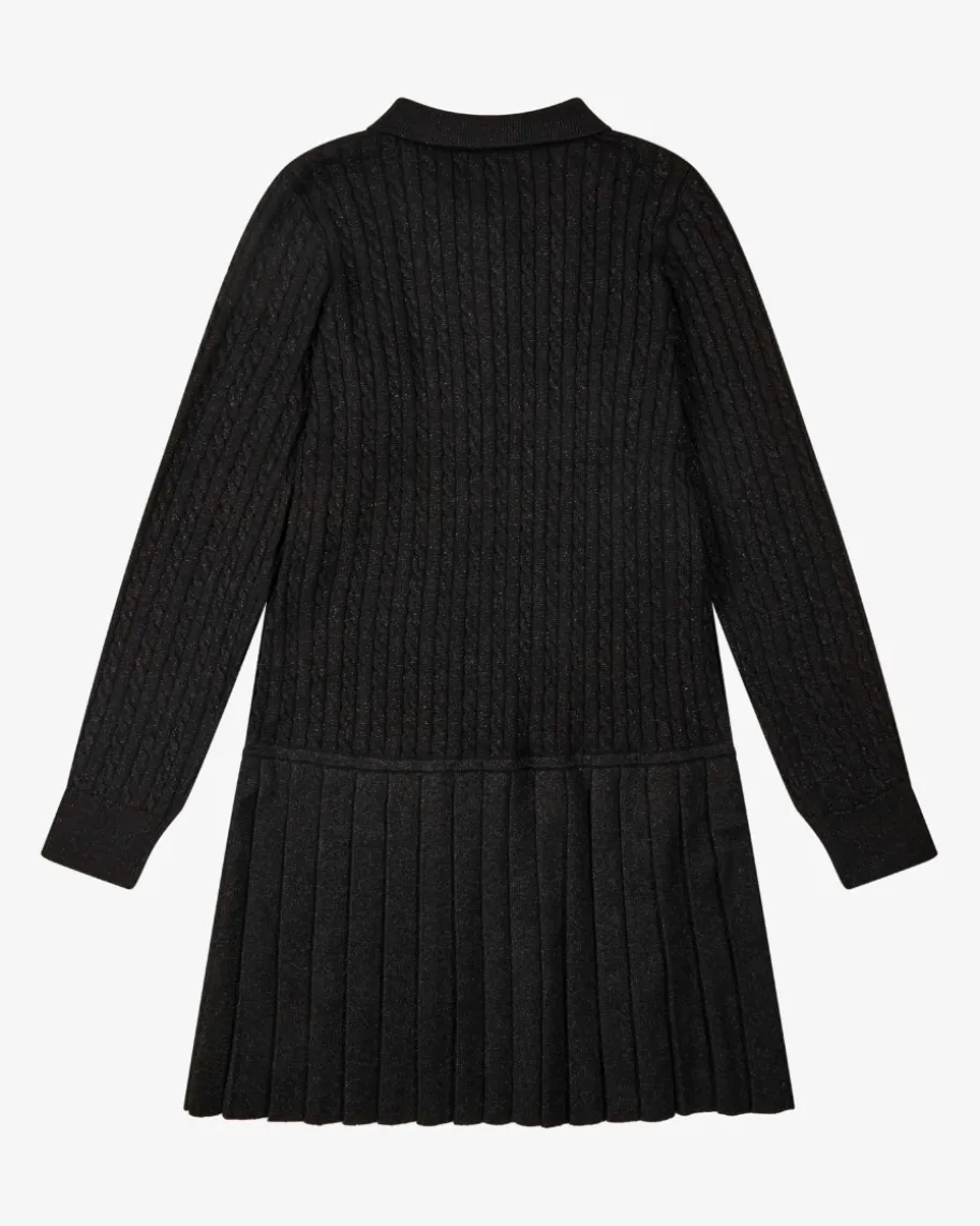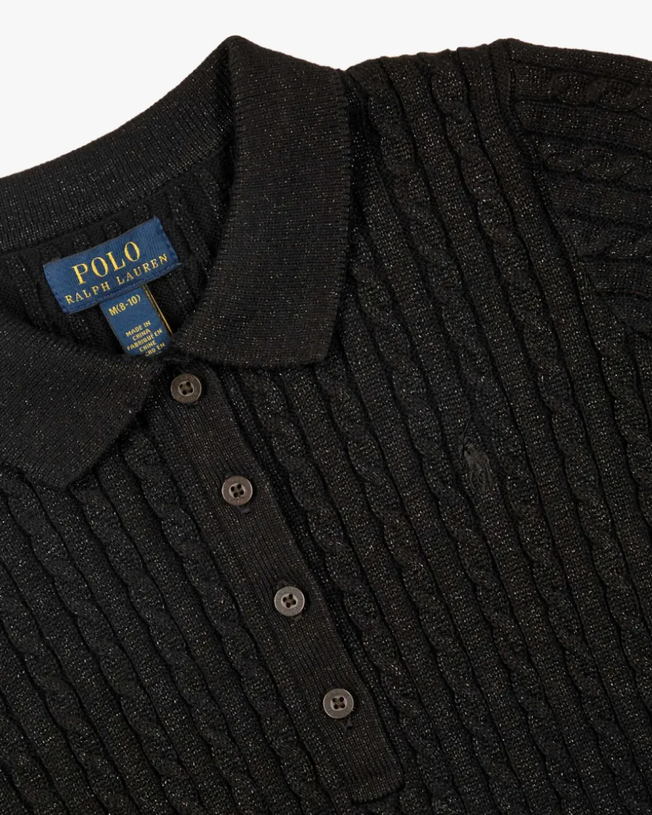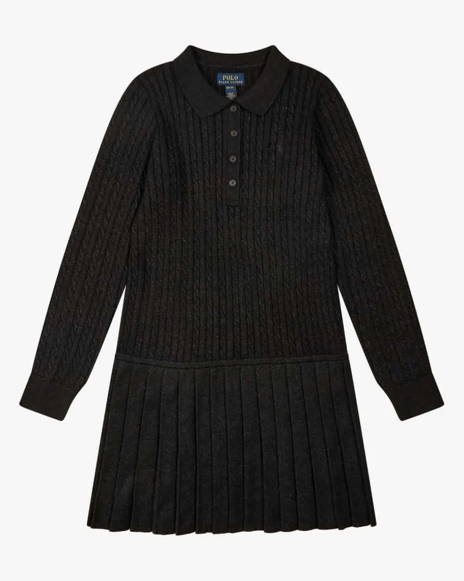 Strickkleid für Mädchen von Polo Ralph Lauren in Schwarz. Das Modell präsentiertsich mit ausgestellter Silhouette und raffiniertem Faltenrock, während dersportive Polokragen einen modischen Twist schafft. Der leichte Baumwoll-Mixsetzt mit den eingearbeiteten changierenden Glitzerfasern edle Akzente undrundet den feminin-sportiven Look gekonnt ab.