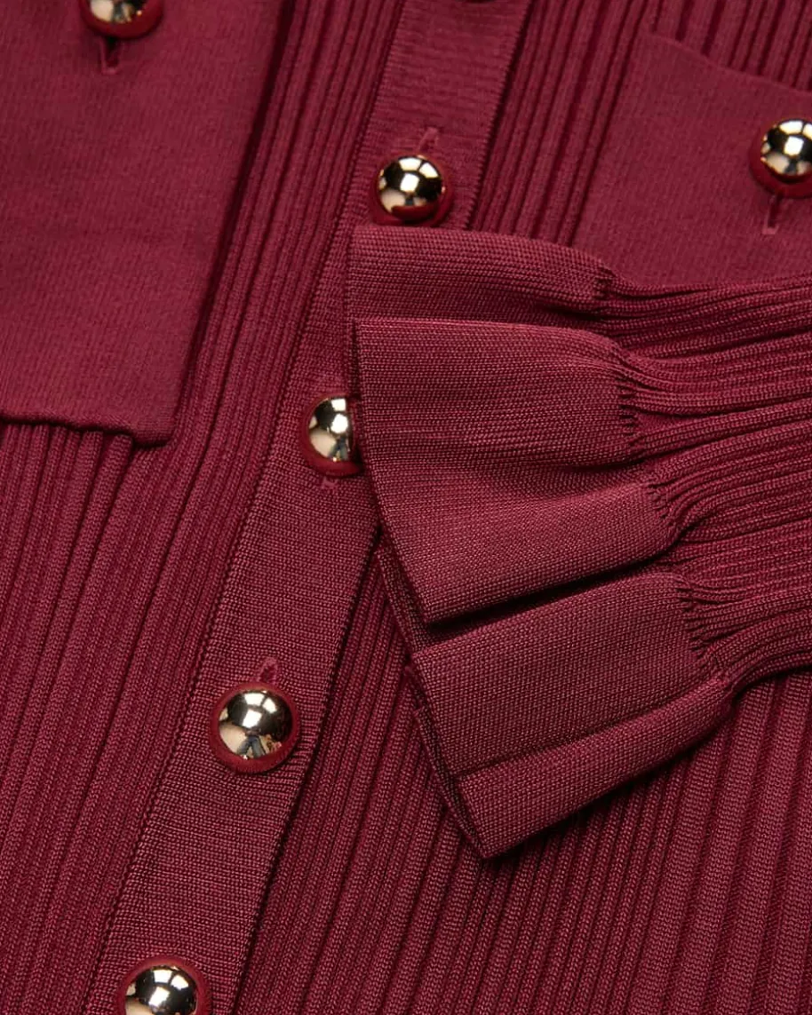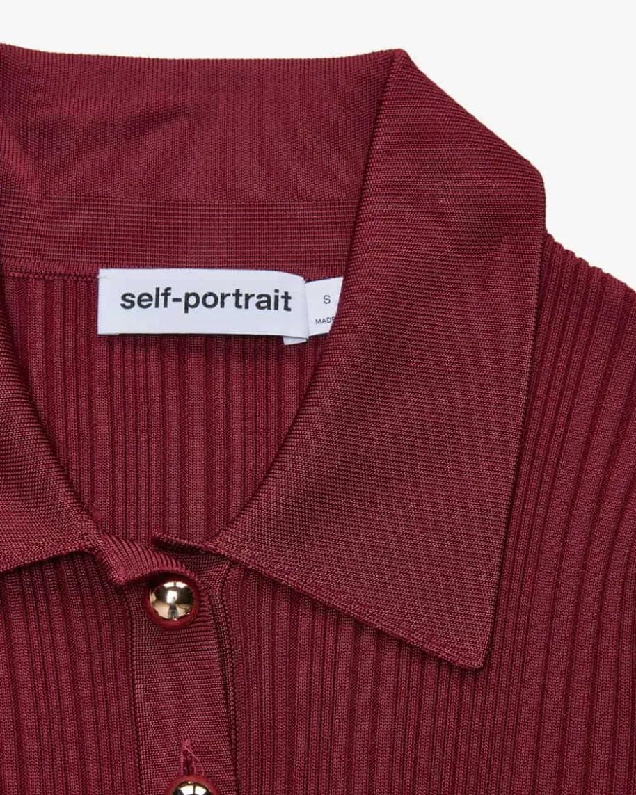 Strickkleid für Damen von Self-Portrait in Burgund. Das Londoner Label steht fürmoderne Cocktailkleider mit Spitze, Cut-Outs und femininer Detailverliebtheit.Auch dieses schmale Modell präsentiert sich mit raffinierten Rippstrick-Verarbeitung, während die edel changierenden Knöpfe und die femininen Rüschen-Details einen modischen Look mit dem gewissen Etwas schaffen.