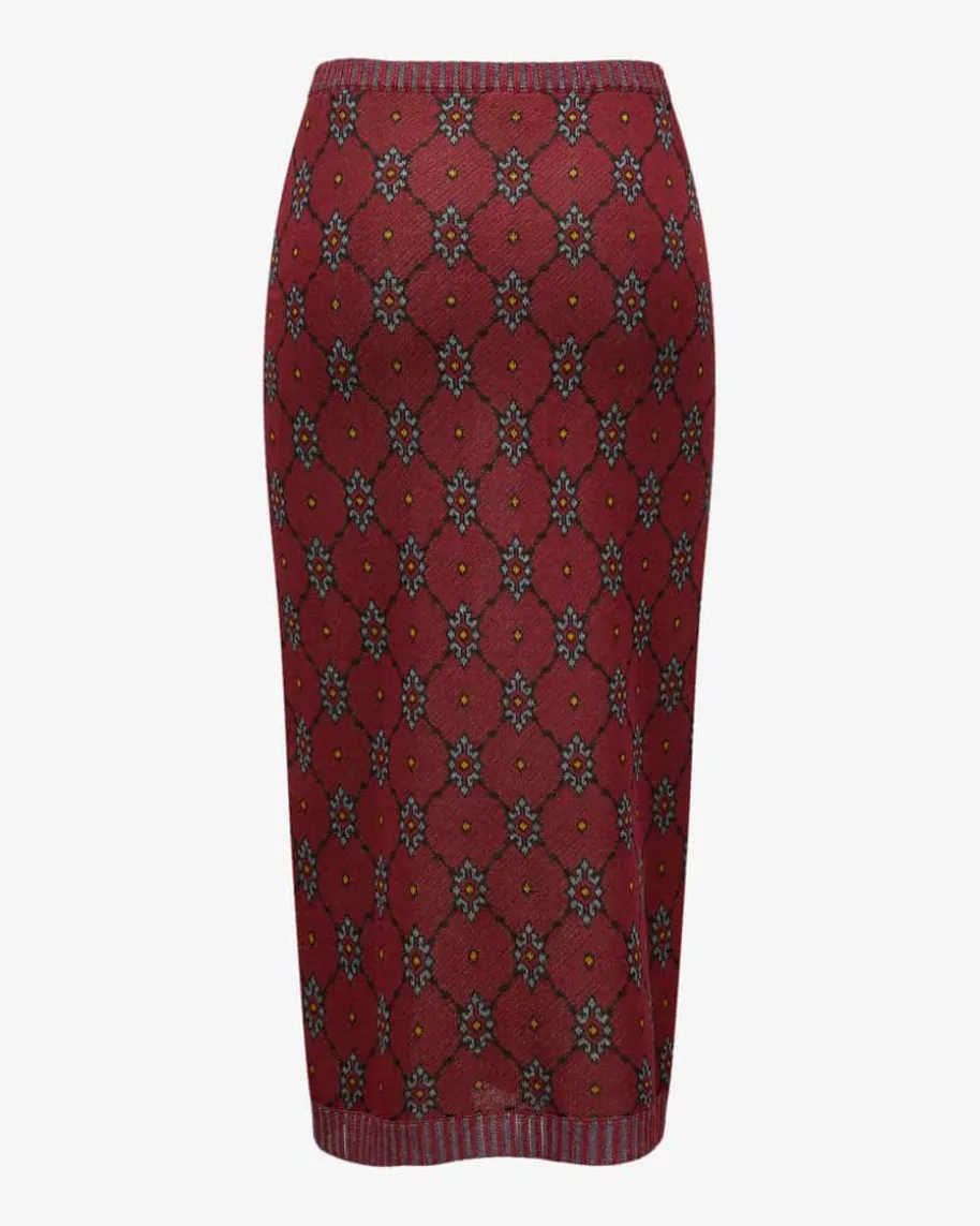 Strickrock für Damen von Etro in Dunkelrot, Blaugrau und Gelb. Dank desmodischen Allover-Dessins besticht das Modell in stilvoller Aufmachung, währendder elastische Bund Komfort verspricht.