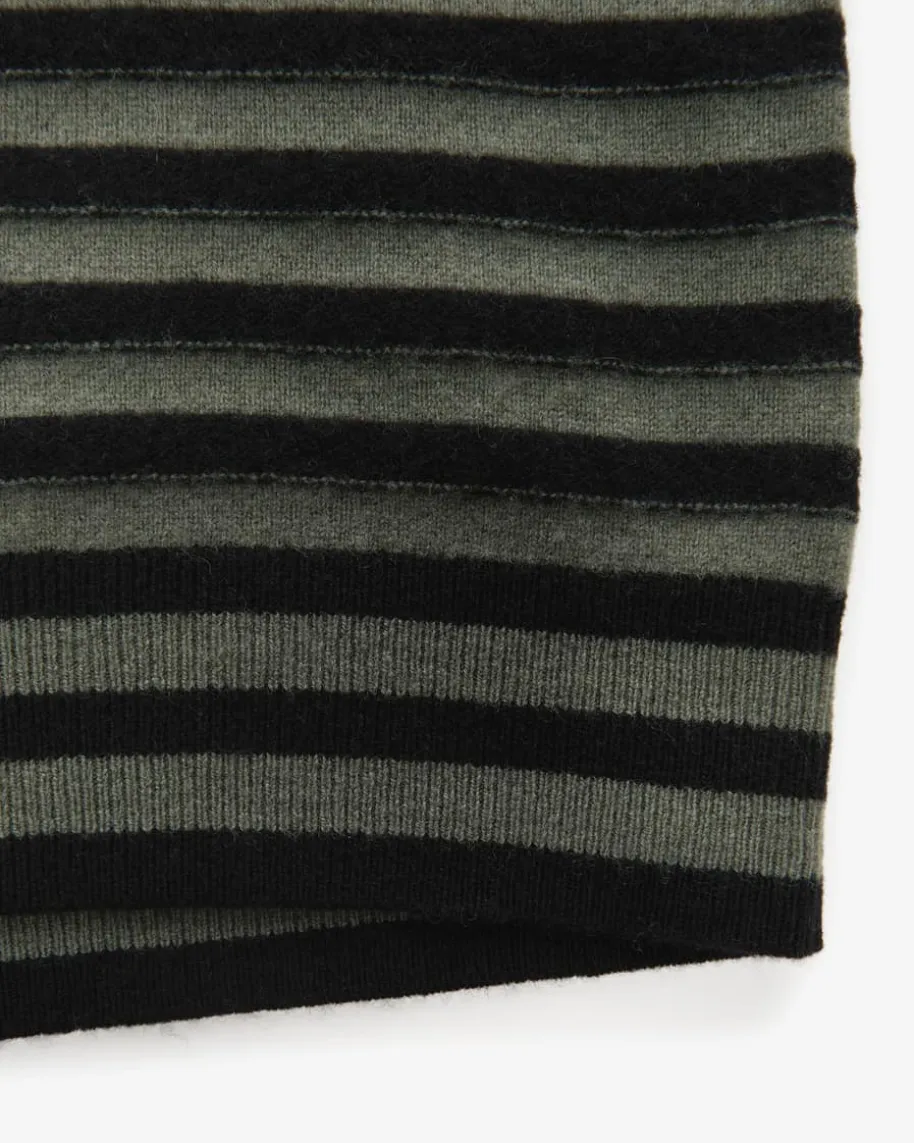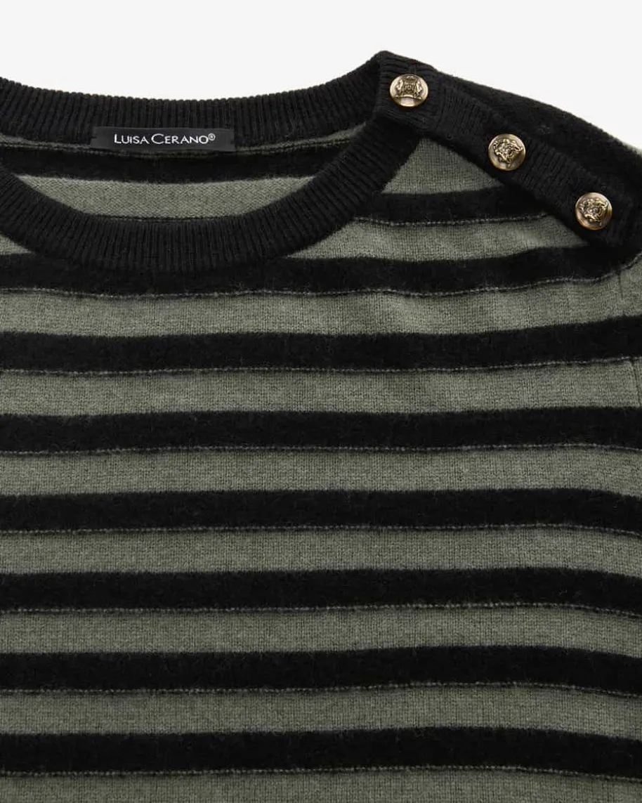 Strickshirt für Damen von Luisa Cerano in Khaki und Schwarz. Das gestreifteModell aus hochwertigem Woll-Cashmere-Mix avanciert dank der feinen Strick-Verarbeitung zum zeitlosen Favoriten, welcher durch die dekorativen,goldfarbenen Wappenknöpfe an der Schulterpartie eine besondere Note im maritimenStil erhält.