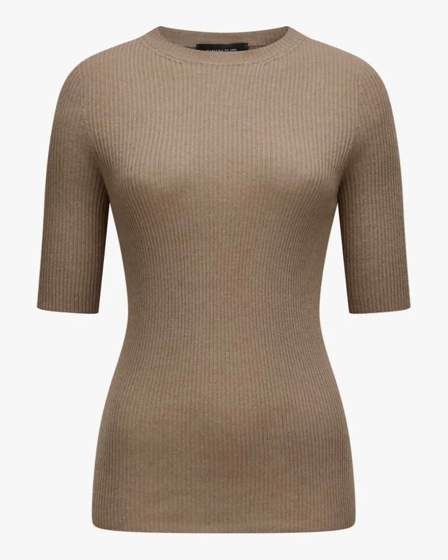 Strickshirt für Damen von Fabiana Filippi in Taupe. Während die schmale Passformmit verlängertem Schnitt sowie das elastische Rippstrick-Design einfigurbetontes Basic kreiert, schafft der hochwertige Merinowoll-Seiden-Mix mitCashmere-Anteil eine angenehm-leichte Haptik.