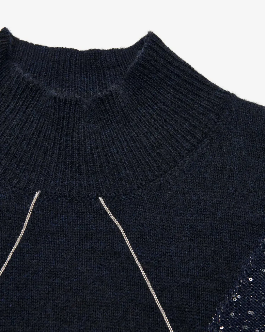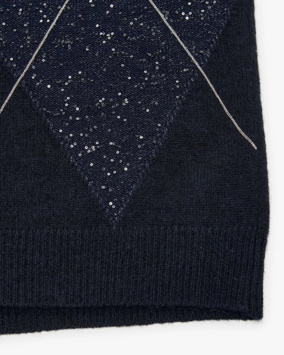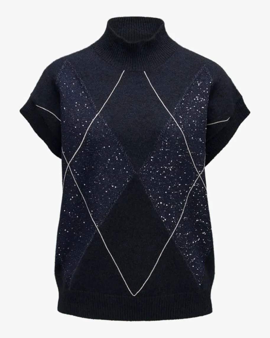 Strickshirt für Damen von Peserico in Navy. Die italienische Marke steht fürfeine Damenmode mit Fokus auf Materialien, Passform und Handwerkskunst. Auchdieses kurzärmlige Modell präsentiert sich mit grafischer Strick-Verarbeitungaus hochwertigem Schurwoll-Cashmere-Seiden-Mix, während changierende Paillettenund feine Ketten-Applikationen einen modischen Look mit dem gewissen Etwasschaffen.