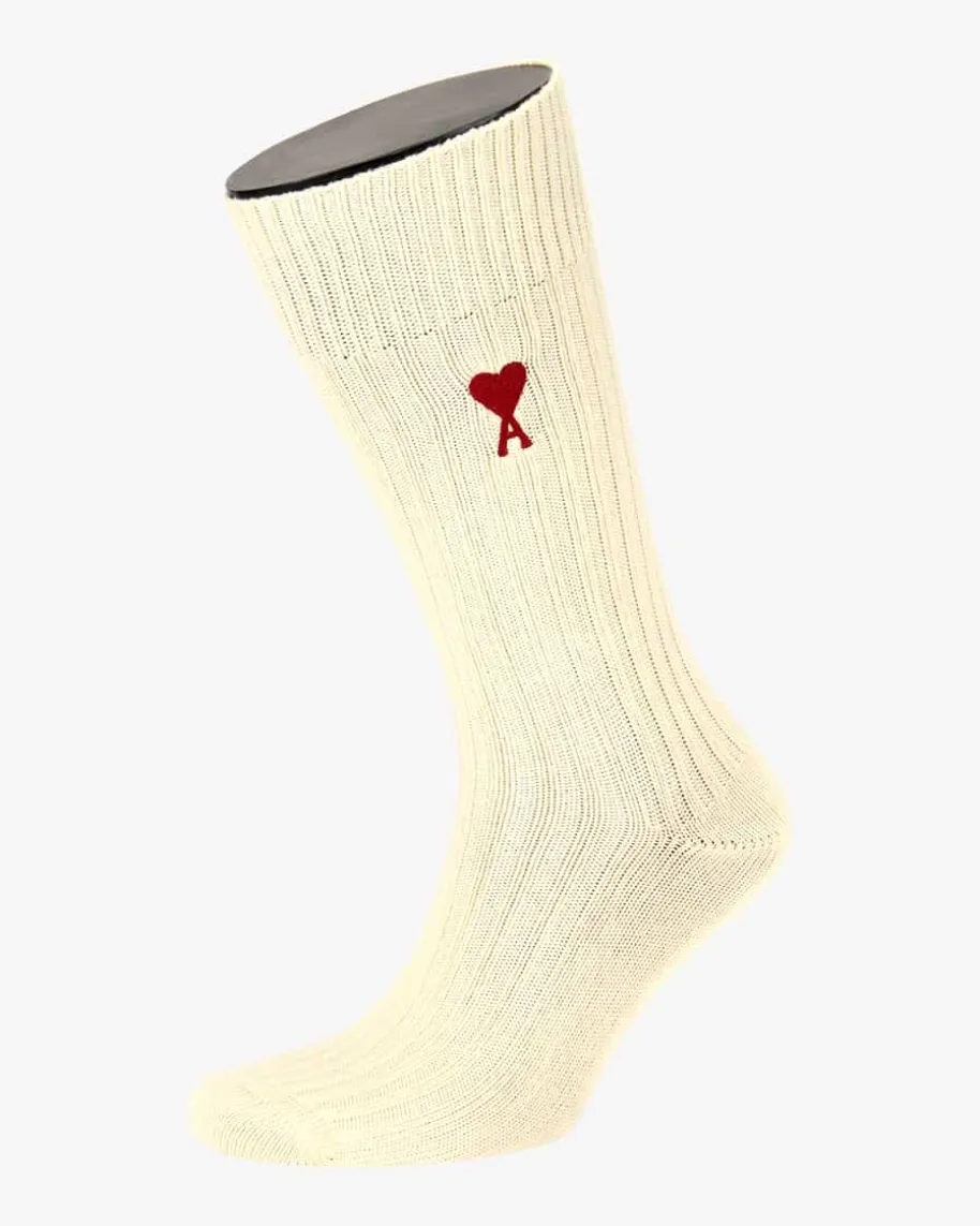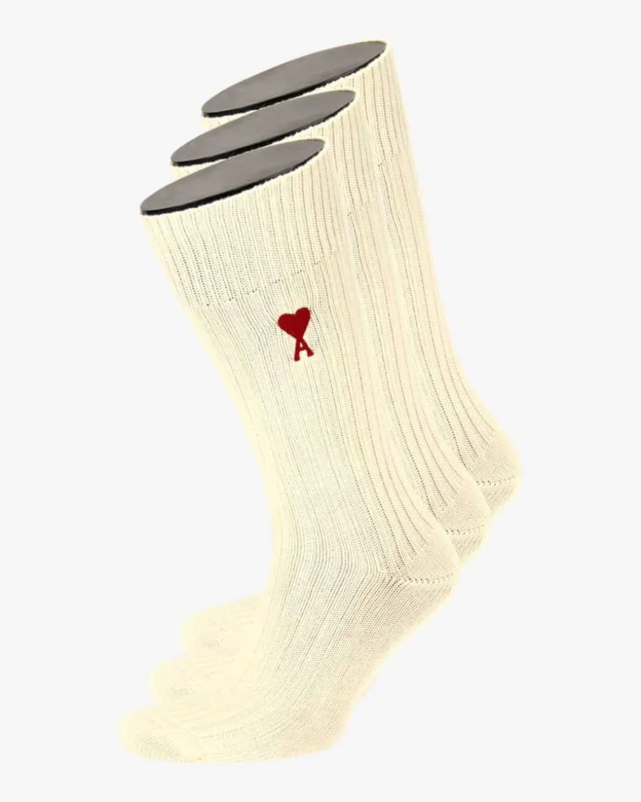 Strümpfe 3er-Set für Herren von Ami Paris in Creme. Mit diesem Set erhalten Siedrei Socken-Modelle mit labeltypscher Logo-Stickerei, die dank des Rippstrick-Bundes sowie dicker Material-Verarbeitung nicht nur für einen hohen Komfortsorgen, sondern auch optische Statements setzen.